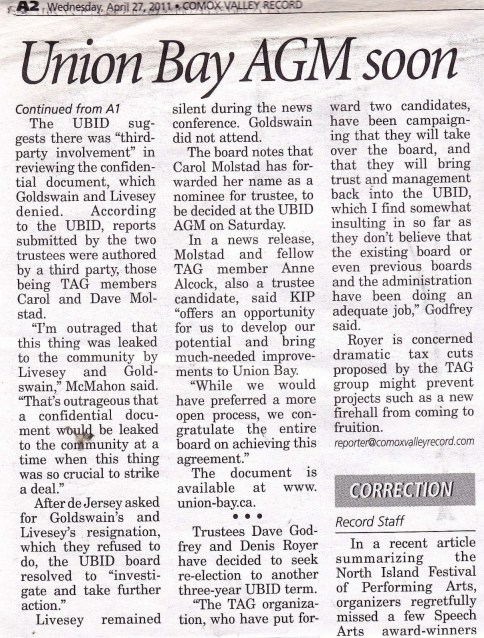UBID trustees Cleve Goldswain and Bruce Livesey — both members of the Taxpayers for Accountable Governance (TAG) group in Union Bay — opposed the agreement.