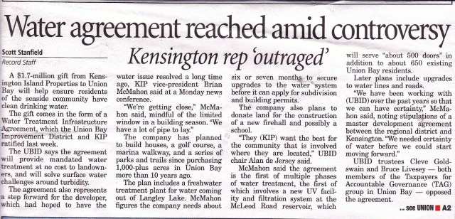 34083 Yukon Inc. (Kensington Island Properties) has proposed a development for Union Bay which follows a comprehensive development plan. This development will encompass the development of approximately 600 hectares of lands within the Union Bay Improvement District and provide the community with a golf course and related facilities, a marina, walkway along the waterfront, a boutique waterfront and various residential and commercial options. The project is estimated to add an additional 3,354 doors to the existing 650 doors currently serviced by the UBID. During the zoning process a Master Development Agreement was agreed to by the Developer and the Comox Valley Regional District. In this agreement the developer agreed to enter into an agreement with UBID to provide water service to the development which may include upgrading the existing service to meet legislated or required standards by Vancouver Island Health Authority (VIHA), UBID or other regulating bodies.UBID had been advised by VIHA that no new subdivisions could be added to the UBID system until water treatment, as mandated, to meet 4-3-2-1-0 was installed and operational.
