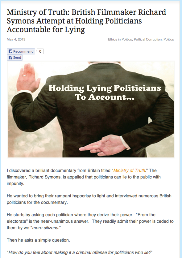 Government Lying Politicians Date: May 4, 2013Author: allthingsunionbay 0 Comments This from Christopher di Armani’s website. Complete article: http://christopherdiarmani.com/10165/politics-2/ethics-in-politics/ministry-truth-british-filmmaker-richard-symons-attempt-holding-politicians-accountable-lying/ Share this: Click to share on X (Opens in new window) X Click to email a link to a friend (Opens in new window) Email Click to share on Facebook (Opens in new window) Facebook Click to print (Opens in new window) Print Like Loading...