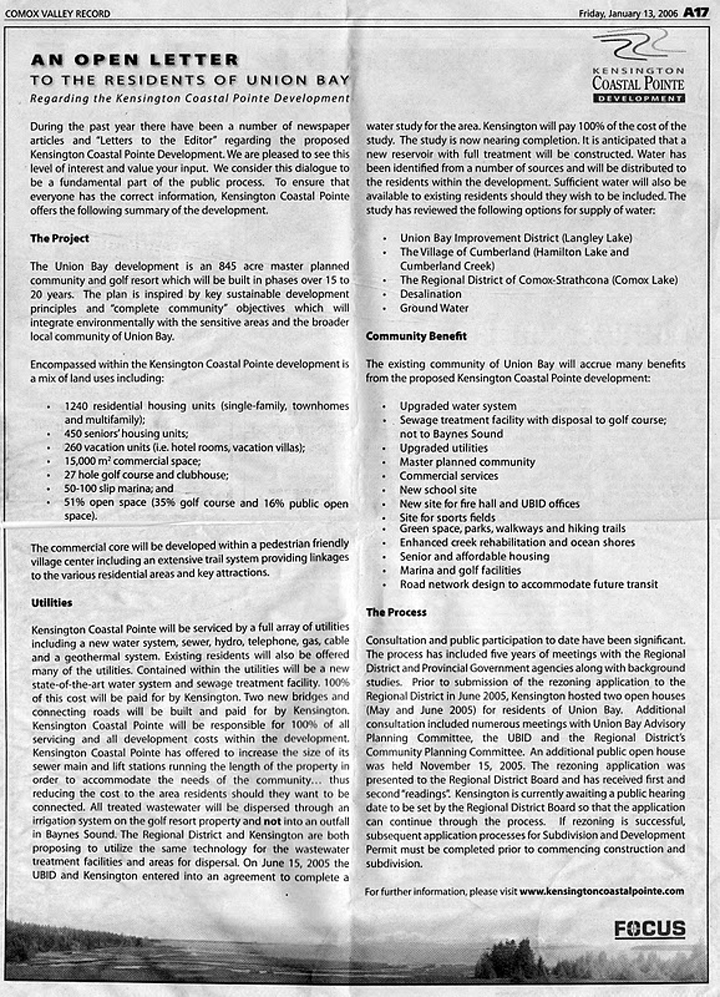 “Kensington Coastal Point has offered to increase the size of its sewer main and lift stations running the length of the property in order to accommodate the needs of the community….thus reducing the cost to the area residents should they want to be connected. All treated wastewater will be dispersed through an irrigation system on the golf resort property and not into an outfall in Baynes Sound.”