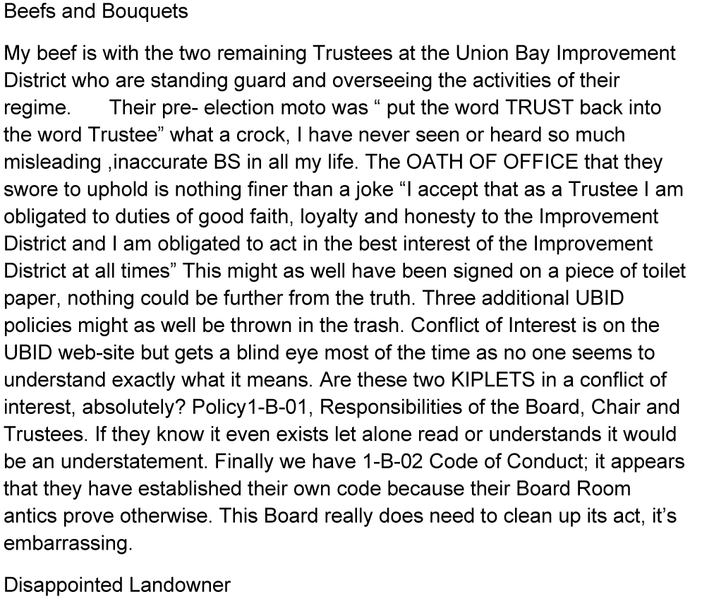 A Beef With the Current Union Bay Improvement District KIPLET Trustees