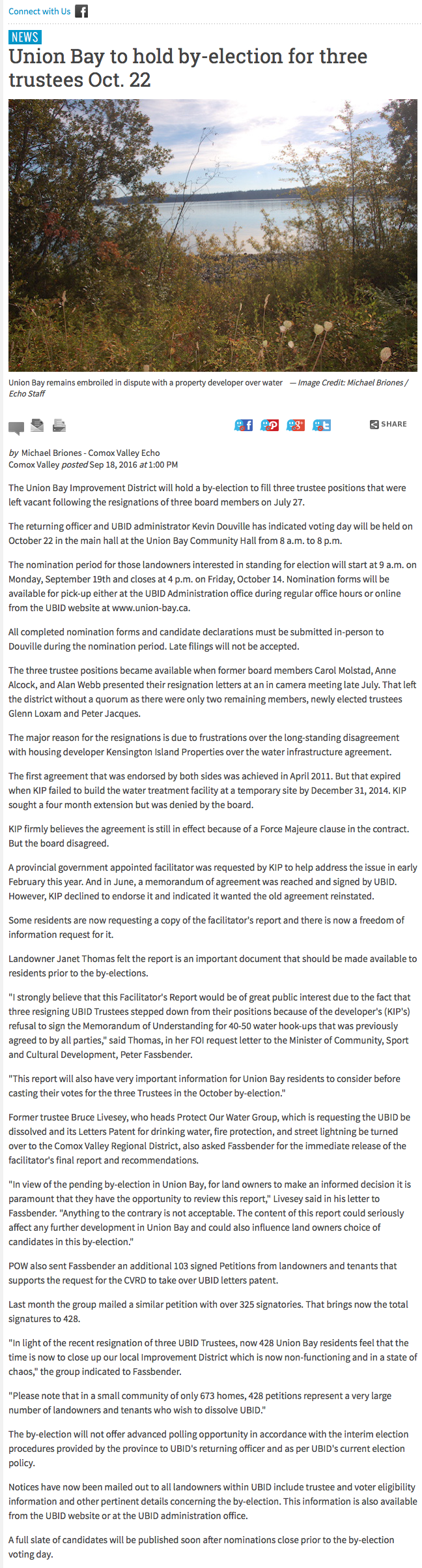 All Candidates Meeting October 19, 2016 from 7 – 9 pm. Union Bay Community Hall.