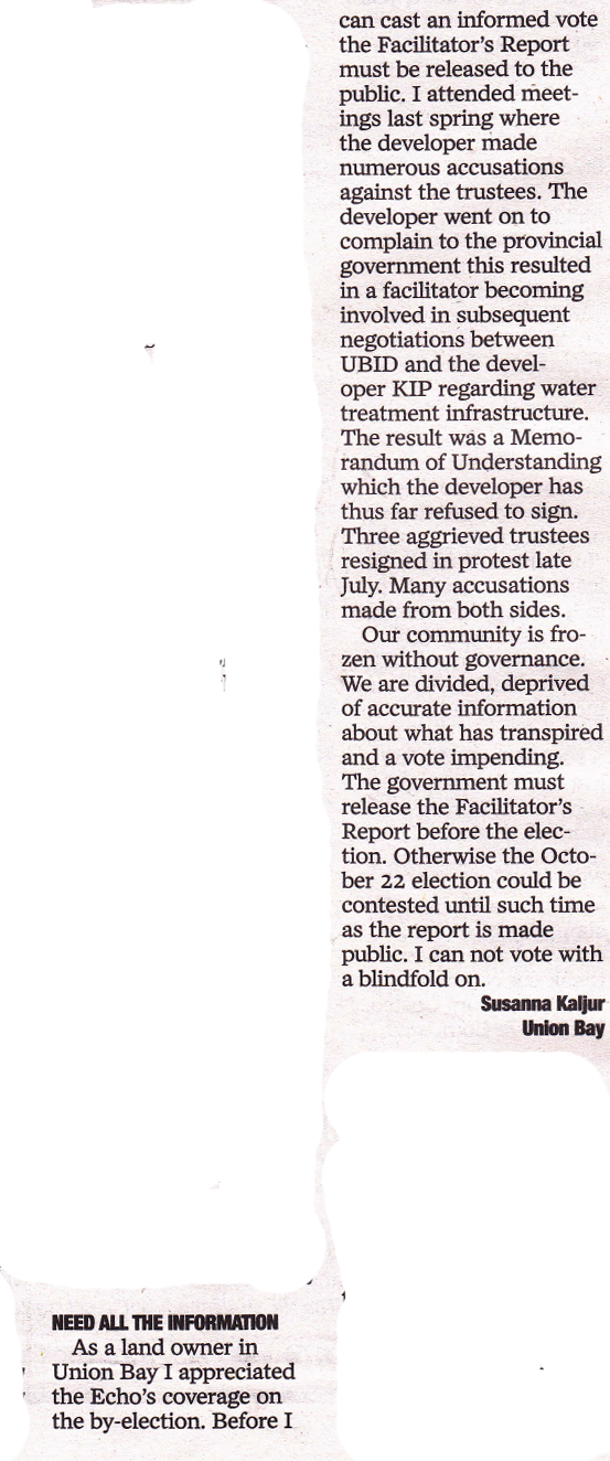 As a land owner in Union Bay I appreciated the Echo’s coverage on the by-election. Before I can cast an informed vote the Facilitator’s Report must be released to the public. I attended meetings last spring where the developer made numerous accusations against the trustees. The developer went on to complain to the provincial government this resulted in a facilitator becoming involved in subsequent negotiations between UBID and the developer KIP regarding water treatment infrastructure. The result was a Memorandum of Understanding which the developer has thus far refused to sign. Three aggrieved trustees resigned in protest late July. Many accusations made from both sides.