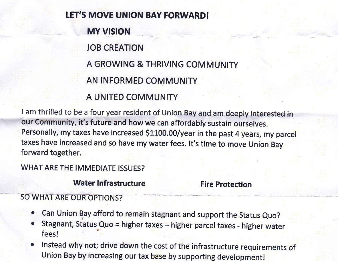 From the flyer distributed by Jednorog below. Why is this worded with or without KIP? That is not the choice. If Kip is ever going to build a home it will pay $8900. per hookup – UBID will use the Capital Expenditure Charges to fund infrastructure costs. Trying to pass this off as though Union Bay would lose something if the expired agreement is not resurrected/extended is misleading. Whenever KIP reaches a new agreement it will pay those Development Expenditure Charges to UBID – there’s no money lost.