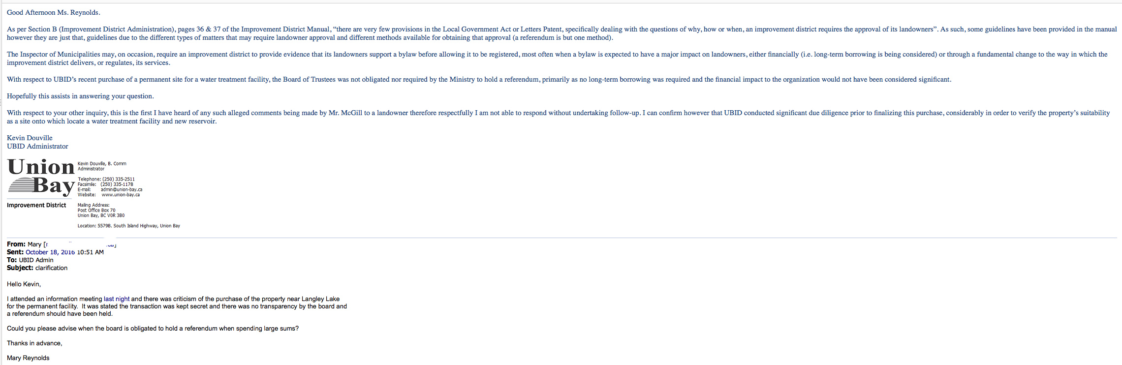Last night Rick Bitten harped on the lack of transparency with the previous board and secrecy purchasing the land for the permanent water treatment facility and claimed it should have gone to a referendum.