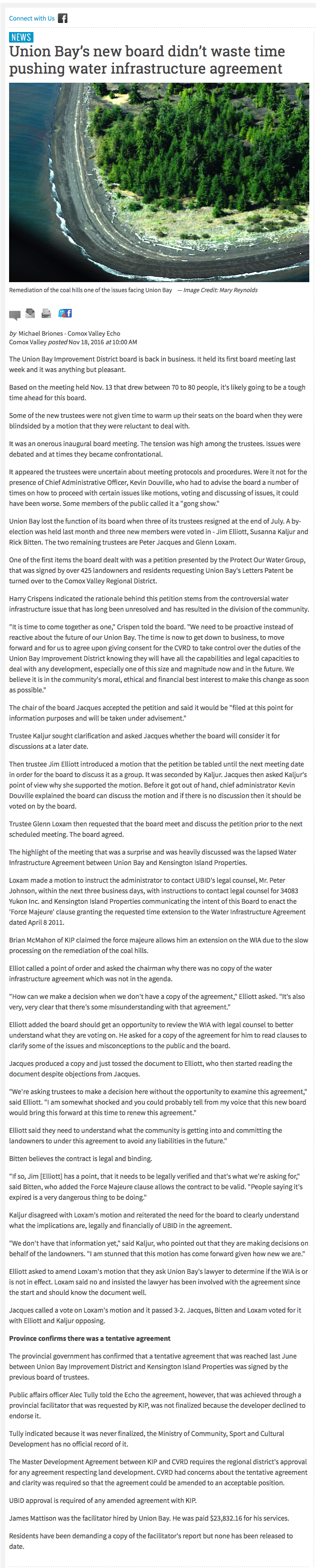 Again, kudos to Michael Briones of the Comox Valley Echo for providing an accurate account of what transpired at the Nov. 13, Union Bay Improvement District Board Meeting. It’s been a while since we had a reporter take pride in providing quality reporting.