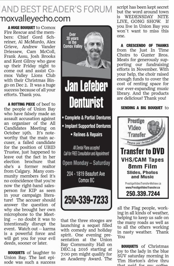 Don’t forget the next episode of the Union Bay Improvement District Gong Show is December 14, 7 pm in the Bill Wood room at the Union Bay Community Club Hall. I think it’s probably safe to attend this function at the Union Bay Community Club Hall as those who disrupted the Oct. 19, event at the Hall expect everyone to abide by the rules when they attend an event/meeting they agree with at the hall. Get used to it. This is how things work in Union Bay. The president of the Union Bay Community Club isn’t going to step in to stop any disruption by members even if he witnesses the disruption as he can claim he was there as an individual, not president. Now do you get it? The rules apply depending on who your friends/relatives are.