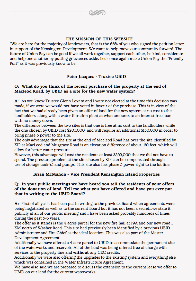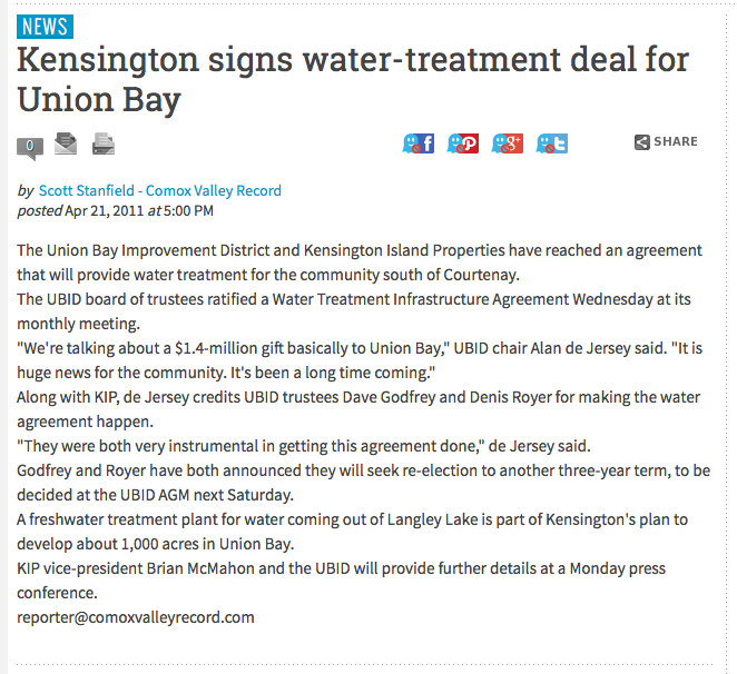 In April 2011, the board in power at the time negotiated a Water Infrastructure Agreement with 34083 Yukon Inc. aka Kensington Island Properties before losing their majority that month at the Annual General Meeting. It was heralded as a GIFT to the community in the local papers quoting the Chair of UBID.