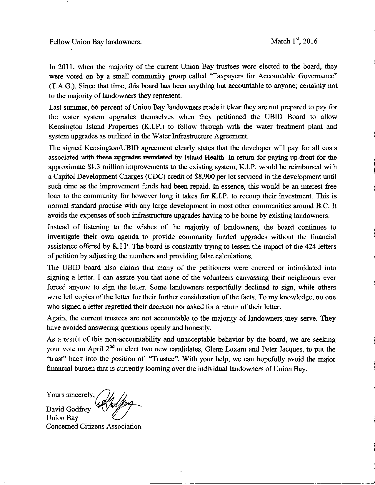 Open letter to Union Bay landowners from David Godfrey.  Note:  This is the first indicator the funds for the Water Infrastructure is not a GIFT – “In essence, this would be an interest-free loan……”