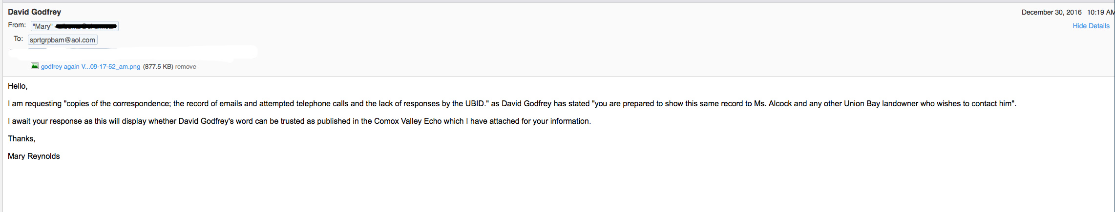 Since David Godfrey seems to be the spokesperson for KIP and has assured those reading his letter today that McMahon is prepared to show the same records Godfrey bases his support for KIP to any Union Bay landowner, which I am, I have requested these same documents. Lets’ see if I get a response!