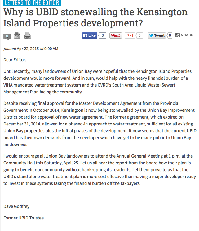 The actions by the three pro KIP trustees provides the perception of a conflict of interest. Something stinks in old dysfunctional Union Bay. Why do they believe KIP shouldn’t have to negotiate a new agreement? Any developer who wants water must negotiate with UBID. Kensington Island Properties aka 34083 Yukon Inc. allowed the agreement to expire -END OF STORY.