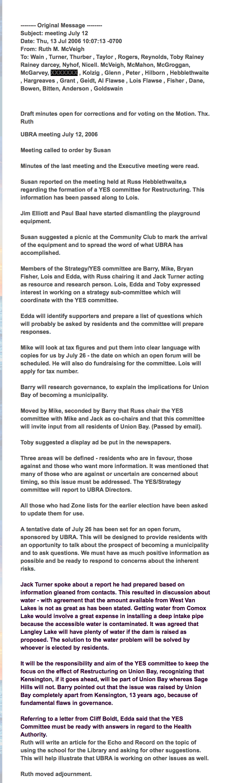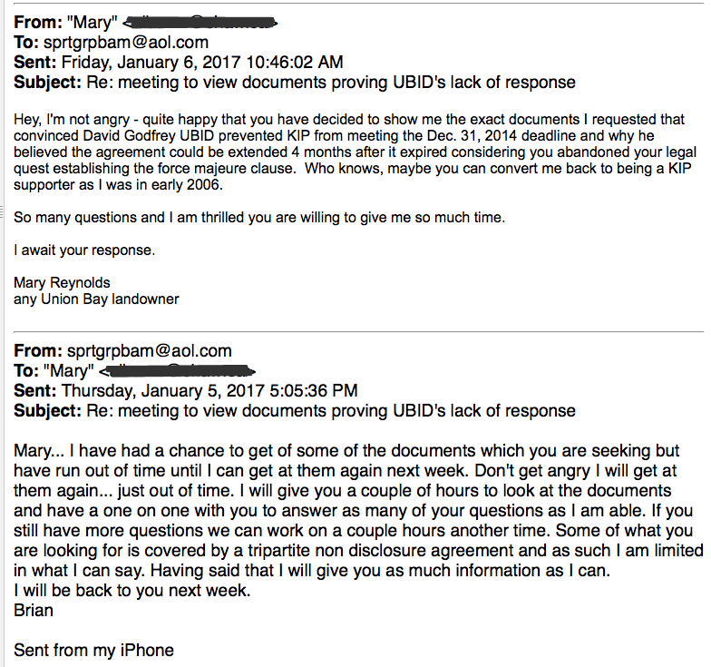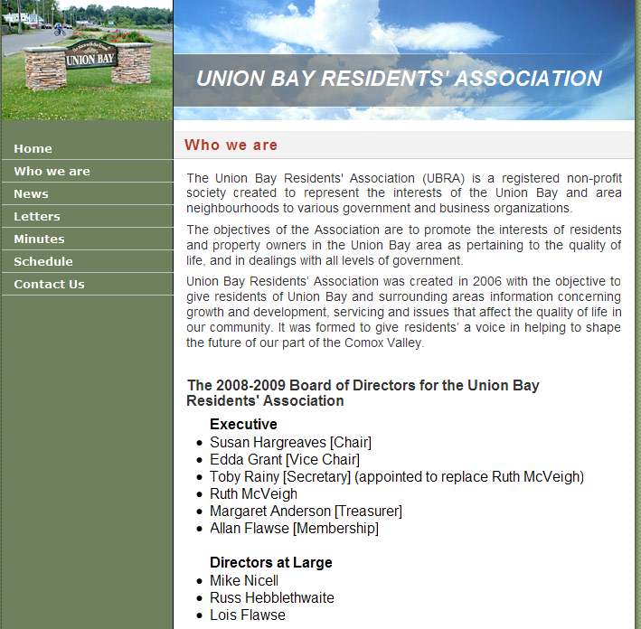 I was a Kensington Island Supporter until I received the following email July of 2006, proving that unelected landowners headed by Susan Hargreaves secretly decided if the municipality referendum was successful in Oct. 2006, Langley Lake would be the water source and this mere months after the public hearings in March 2006 where Bob Long of the Regional District assured landowners Langley Lake would not even be considered, was not on the table.  The community supported the project based on the information provided at the information meetings.  Note the VP of KIP was a member of the Residents’ Association.  When I questioned why these people thought they could make a decision regarding the water source, Hargreaves and McVeigh refused to respond and although I paid a membership fee to the Residents’ Association, they never sent anymore updates.  I did receive a response from Ruth McVeigh where she told me to do something anatomically impossible.  Hargreaves carried on the charade as head of the Residents’ Association even after they were no longer in good standing as a non profit as they only filed one annual report in 2007 and yet continued to collect dues from members.  They were finally struck off in Sept. 2010. http://maryreynoldsunionbayblog.blogspot.ca/2011/12/kensington-island-properties-and-union_31.html