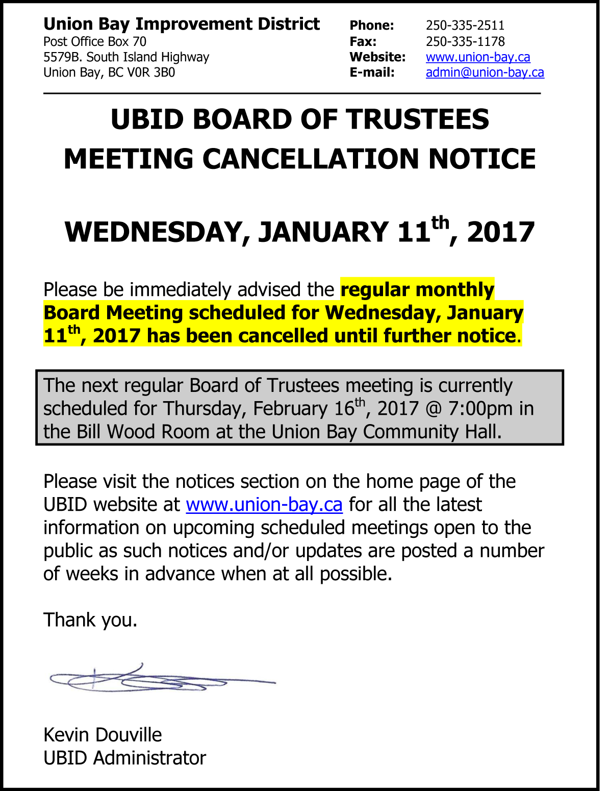 NOTE: I was concerned the meeting might have been replaced by an in-camera one preventing the public from attending but have been advised by UBID Administrator that it has not been replaced by an in-camera or any other meeting. Would certainly like to know why it was canceled. What the hell is going to happen in Feb. if we don’t have an Administrator – no public meetings?