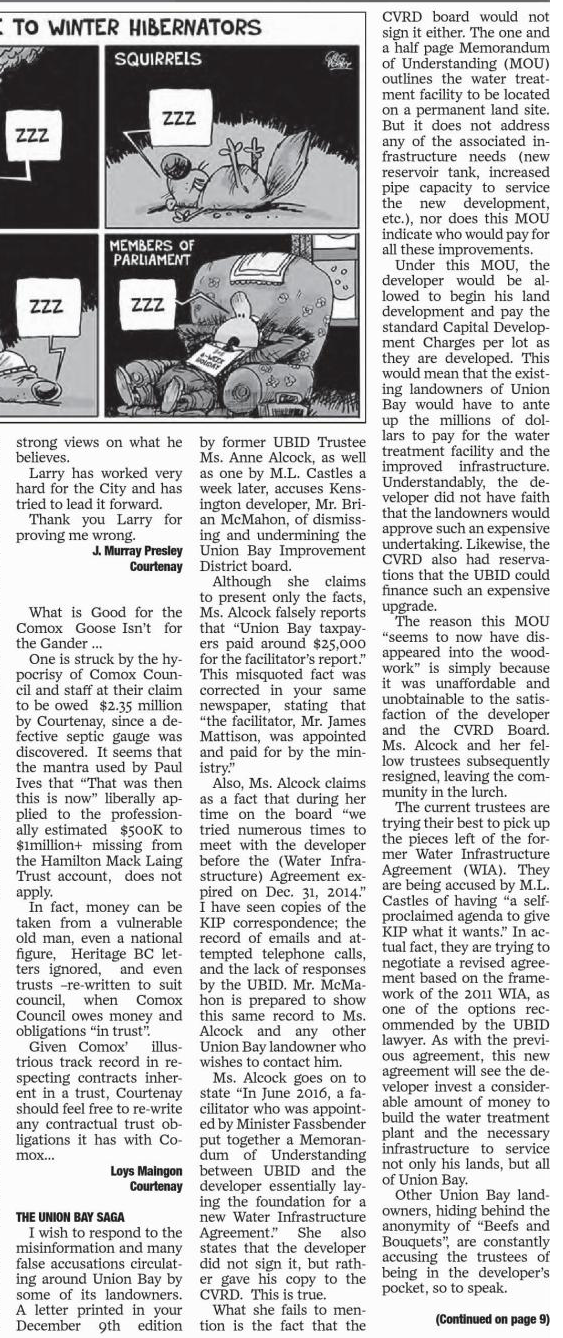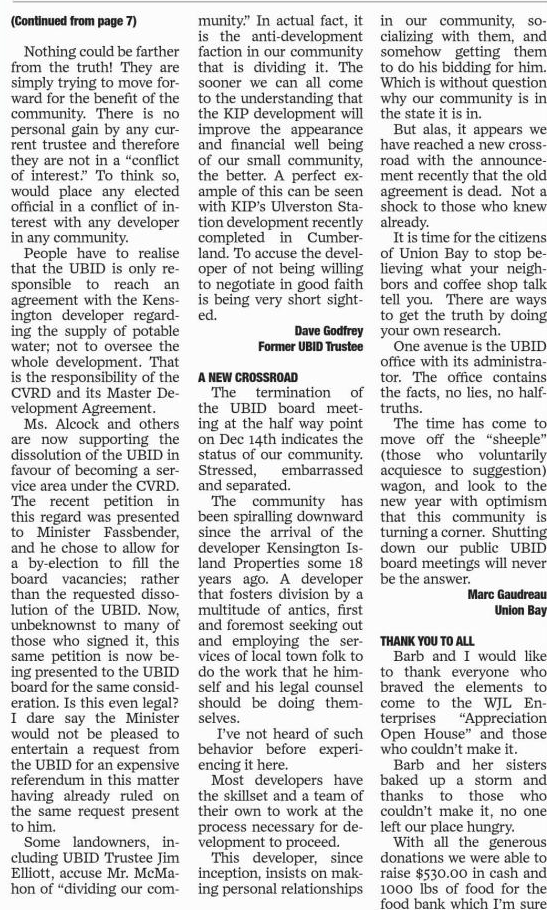 Let’s see the evidence. David Godfrey claims McMahon has evidence and is willing to show any Union Bay landowner. He can’t show anything because it’s fabricated – a nice way of saying bullshit. David Godfrey is a flunky to this sleazy developer.
