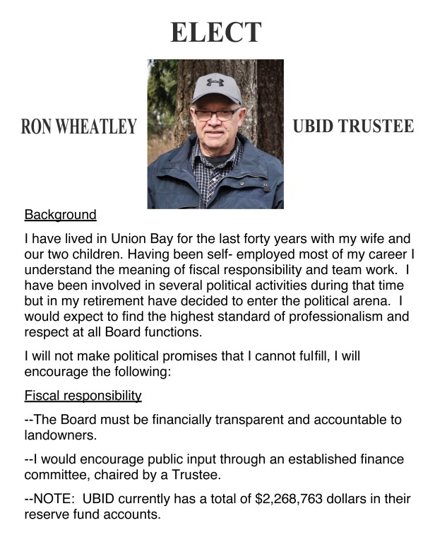 There’s a big difference between someone who claims to have lived in Union Bay for four generations, worked out of town and never bothered to follow or get involved in the issues facing Union Bay and someone like Ron Wheatley who has lived in Union Bay for over 40 years and has been involved and kept up with each and every issue in his community. Ron is an excellent candidate who really does understand the issues and actually enjoys speaking one on one with landowners and is more than willing to answer any questions landowners have. Ron won’t tell you he’s too busy to answer questions unlike candidates Bitten and Haraldson. Ron doesn’t have to run away because he has taken the time to understand the challenges facing our community. Ron wants you to be proud of your Trustees.