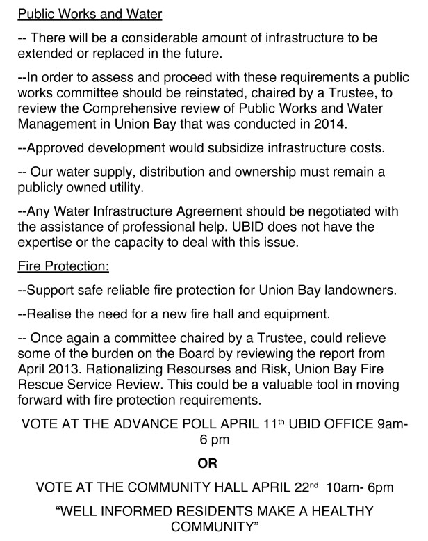 All Candidates Meeting APRIL 6, 7 pm at the Union Bay Community Hall