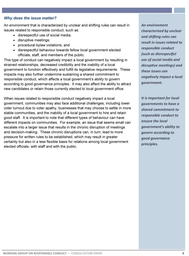 When issues related to responsible conduct negatively impact a local government, communities may also face additional challenges, including lower voter turnout due to voter apathy, businesses that may choose to settle in more stable communities, and the inability of a local government to hire and retain good staff. It is important to note that different types of behaviour can have different impacts on communities. For example, an issue that seems small can escalate into a larger issue that results in the chronic disruption of meetings and decision-making. These chronic disruptions can, in turn, lead to more pressure for written rules to be established, which may result in greater certainty but also in a less flexible basis for relations among local government elected officials, with staff and with the public.