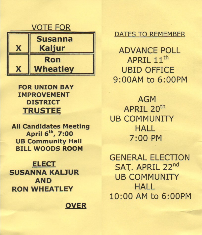 Six candidates were vying for three trustee positions on the Union Bay Improvement District Board of Trustees in Oct. 2016. There had been an All Candidates Meeting hosted by landowner and KIP spokesperson David Godfrey on Oct. 17, 2016 at the Union Bay Community Club Hall which was well attended and ran smoothly.