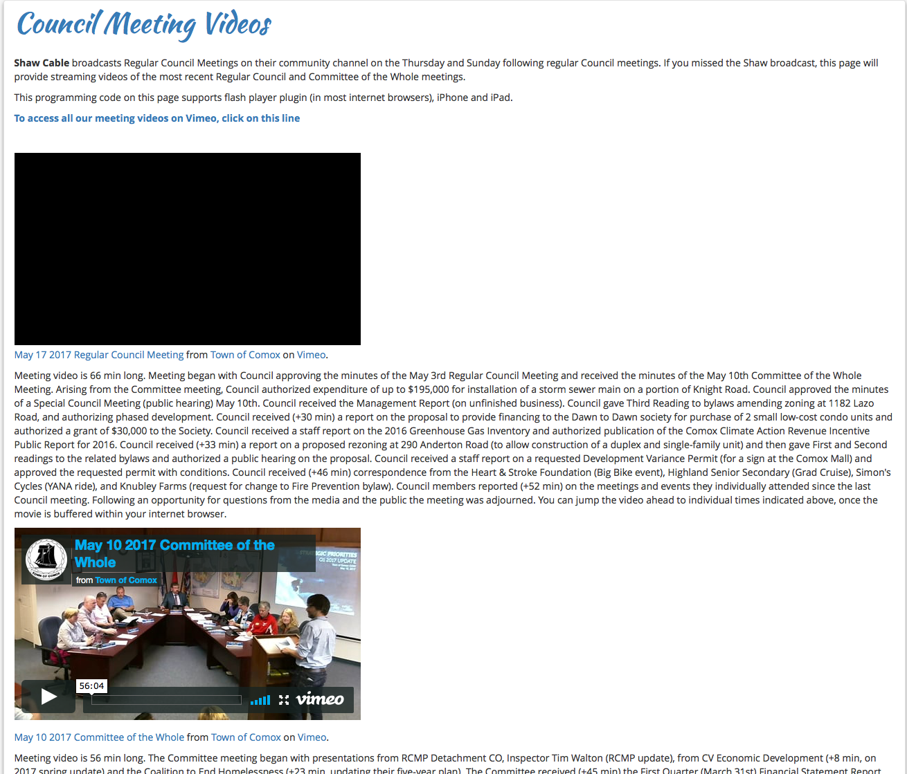 Comox Council provides good audio and video of their meetings. Unsure if it’s staff that post them on Vimeo with a brief description of what transpired during the meeting or if it’s an outside company that handles it for them. This is what we need for the UBID public meetings.