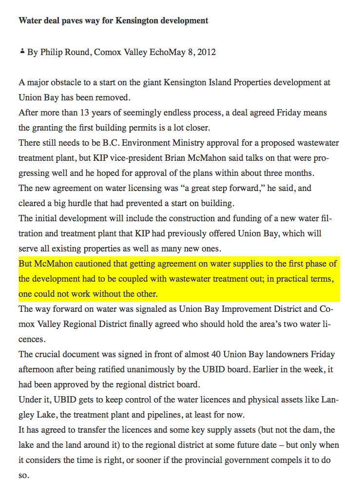 So, do you think KIP is going to build a sewage treatment facility? Where will the sewage go? Can’t go out to Baynes Sound. Can’t go to water an imaginary golf course as that still means a very expensive system to build for how many homes? We now know there is a limited number of connections and KFN is also wanting water so KIP can’t have them all.