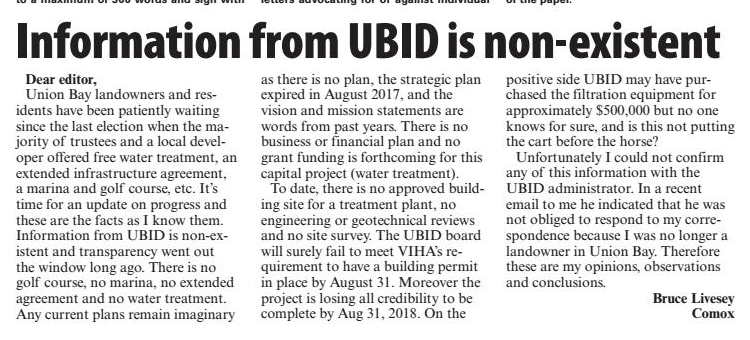 This is the stage Union Bay was at in March 2016. Obviously, the previous board and Administrator were on target to meet the Island Health deadline. Jacques and Loxam along with David Godfrey and their petition demanding UBID give KIP an extension on the expired 2011 Water Infrastructure Agreement threw a wrench in the works.