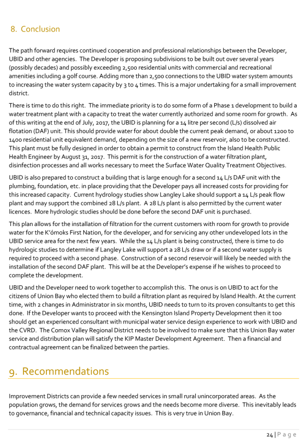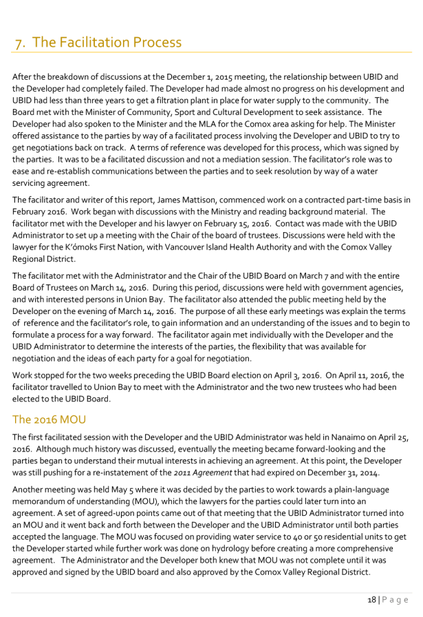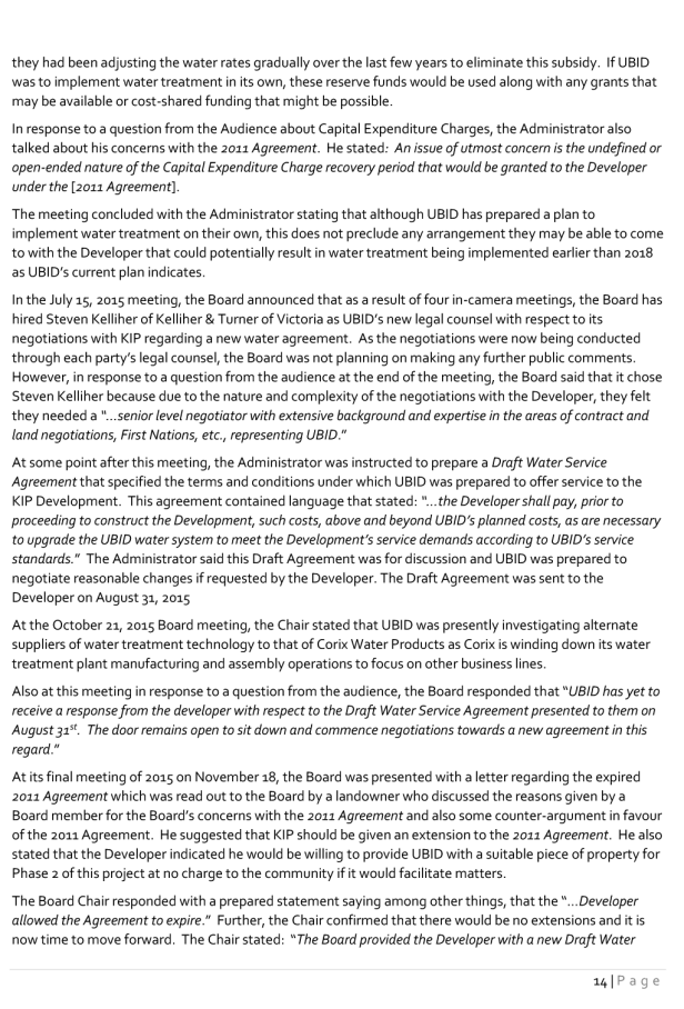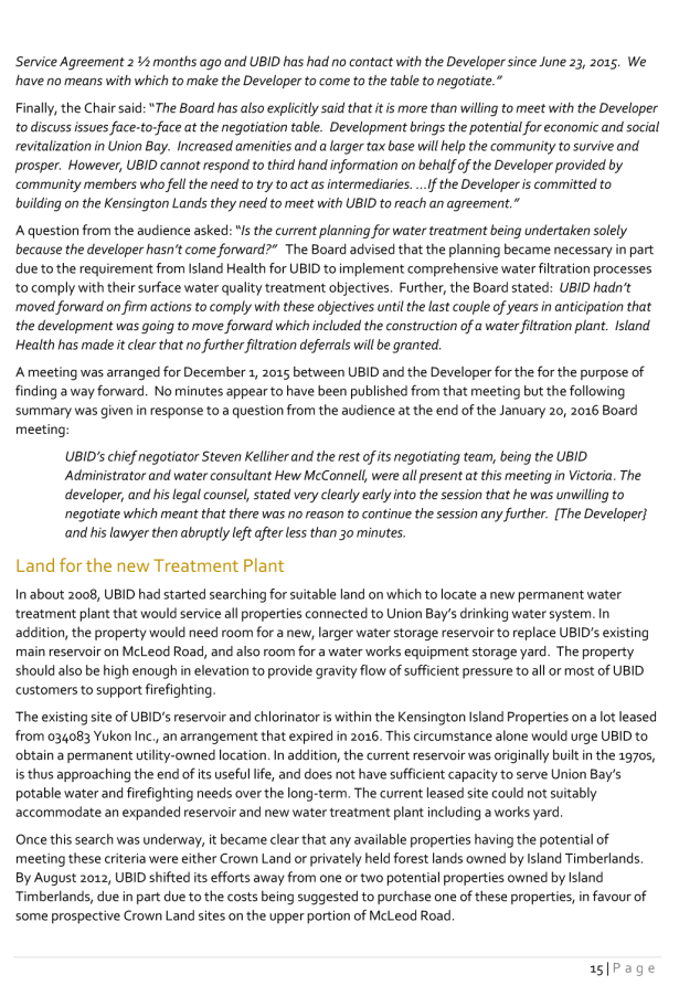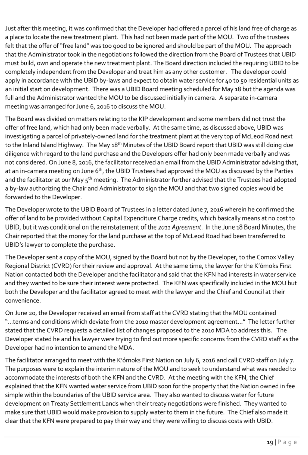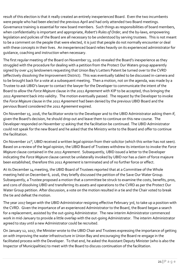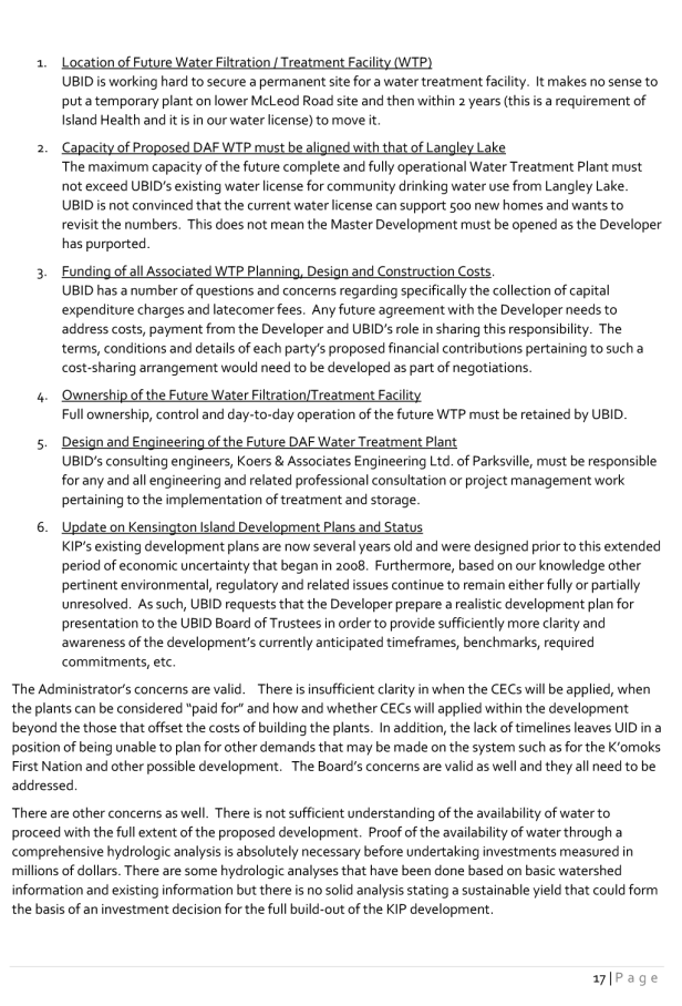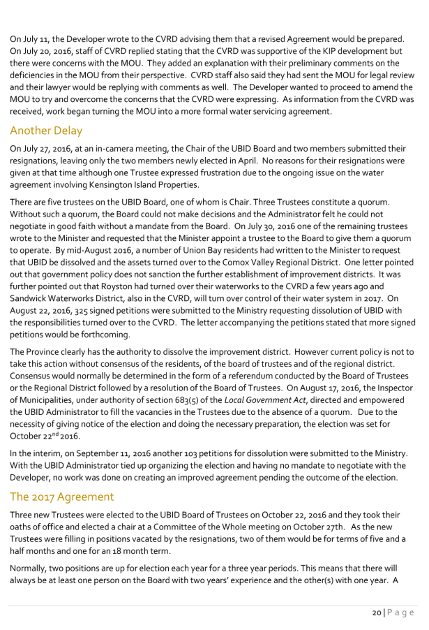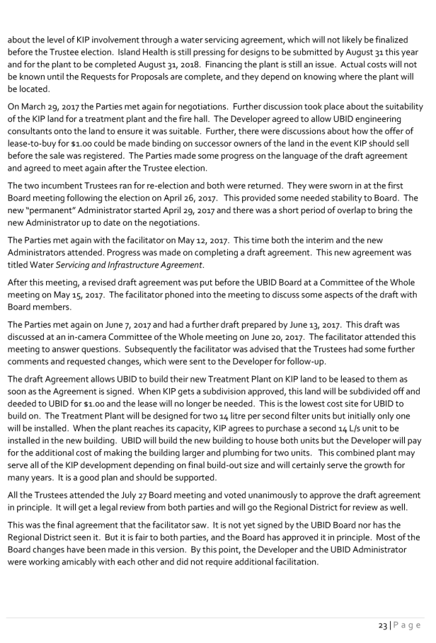 The Facilitator seems to have gotten some of his misinformation from the developer or his kiplets as his conclusion no reasons were given for the resignation of three trustees July 27, 2016, and decided that Anne Alcock’s letter expressed frustration due to the ongoing issue on the water agreement involving Kensington Island Properties. Gee, that’s not the impression I got from reading her letter. Thought it was pretty clear.