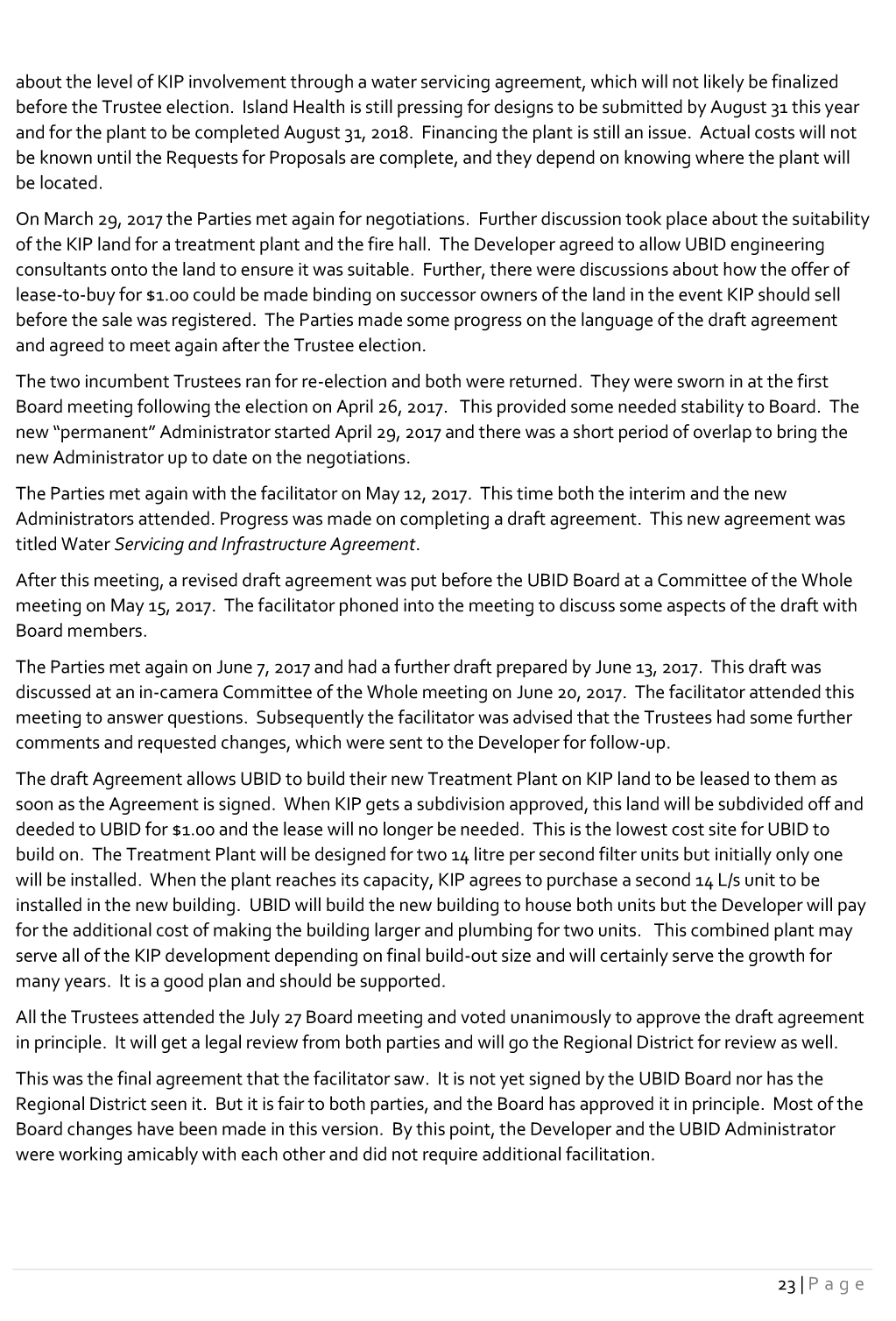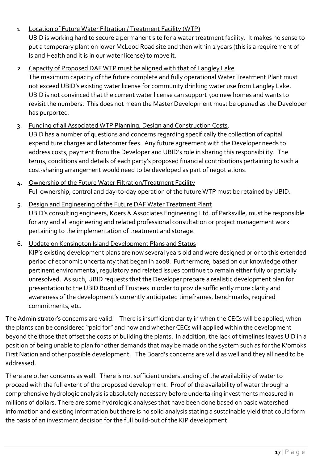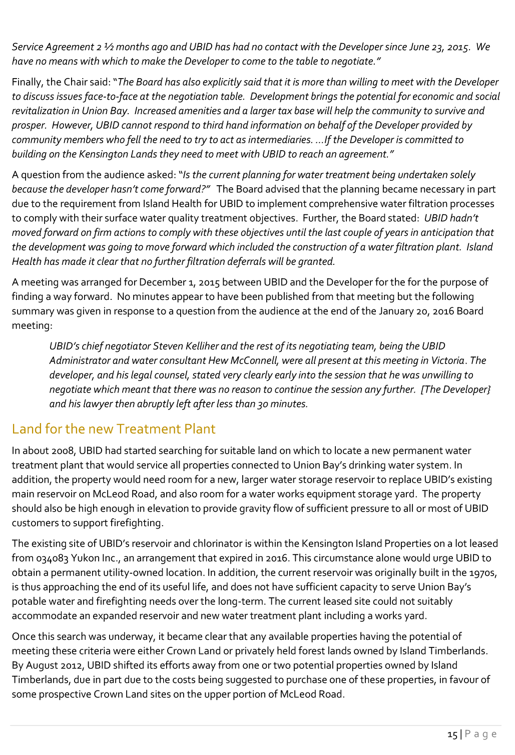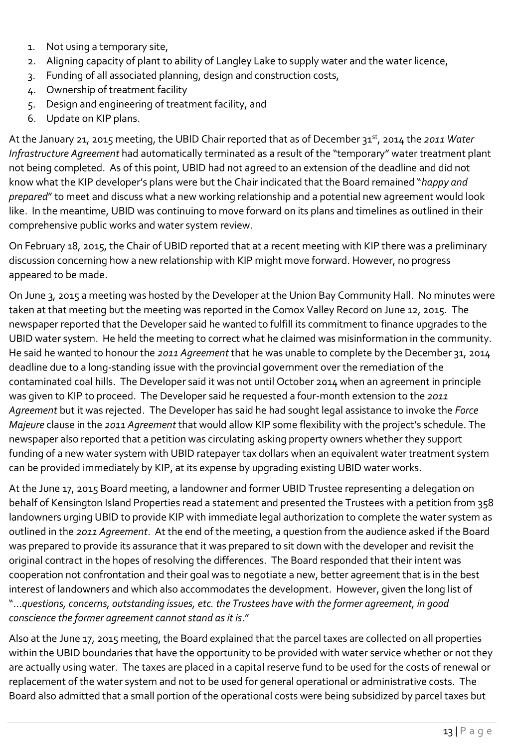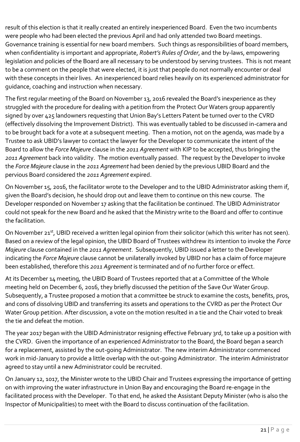The Facilitator seems to have gotten some of his misinformation from the developer or his kiplets as his conclusion no reasons were given for the resignation of three trustees July 27, 2016, and decided that Anne Alcock’s letter expressed frustration due to the ongoing issue on the water agreement involving Kensington Island Properties. Gee, that’s not the impression I got from reading her letter. Thought it was pretty clear.