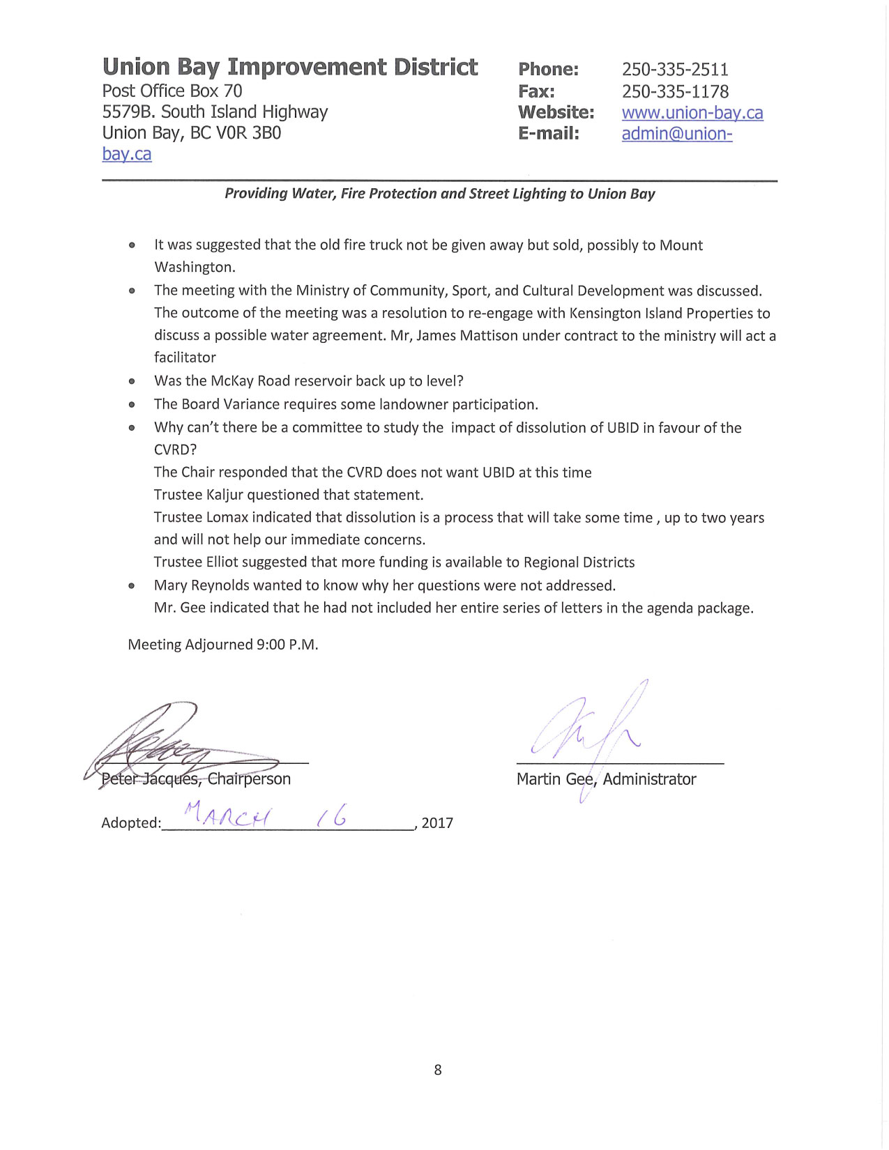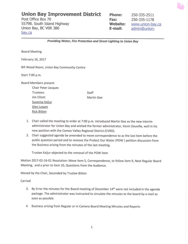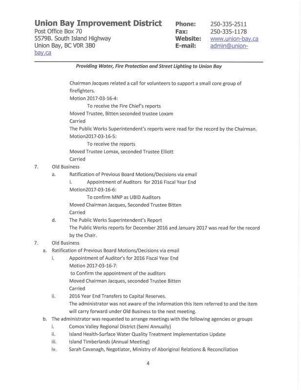 There is no need to have the minutes approved again – they have already been approved and signed! The March 2017 meeting minutes were approved at the May 2017 meeting because there was no regular Board Meeting in April due to the Union Bay Improvement District Annual General Meeting.
