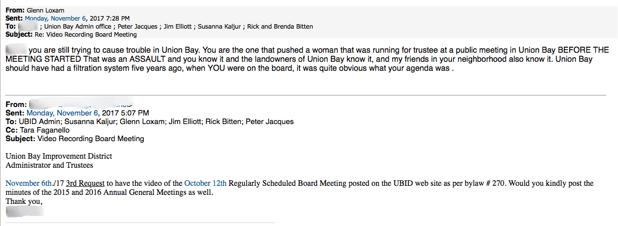 Look at the response to an email by Union Bay Improvement District Trustee Glenn Loxam.