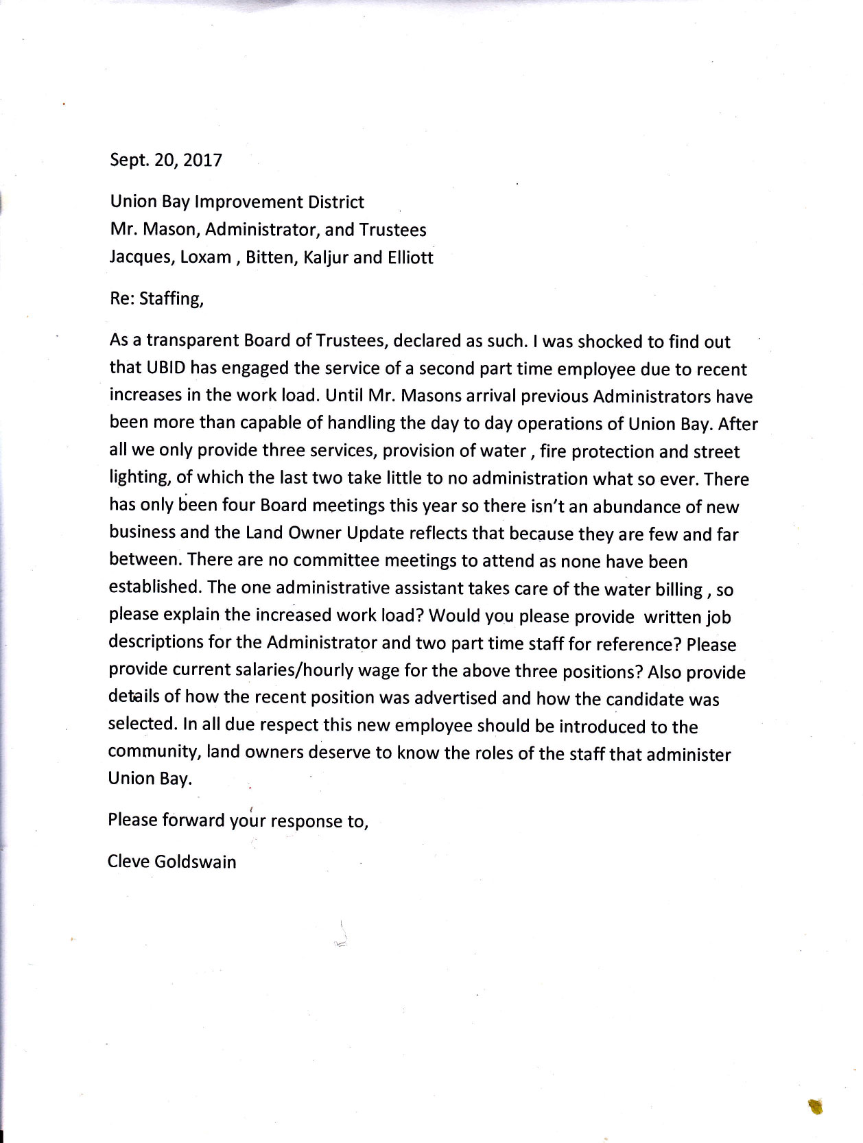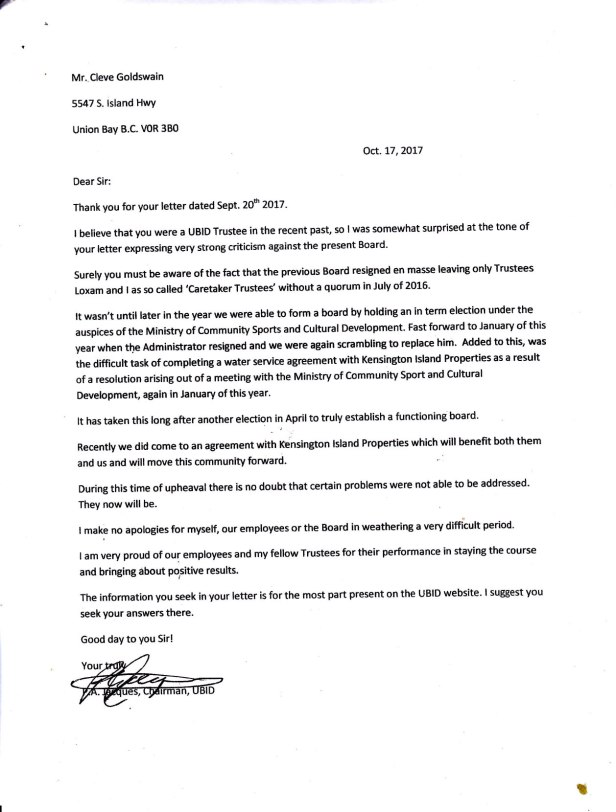 Imagine being a landowner and submitting a letter to the Board of Trustees requesting information related to the Union Bay Improvement District operations and receive a response which contains none of the information requested and instead is a rant defending the lack of progress. The Chair believes all the information is on the website. This Chair admitted a year ago he was computer illiterate and there is no reason to believe he is any the wiser.