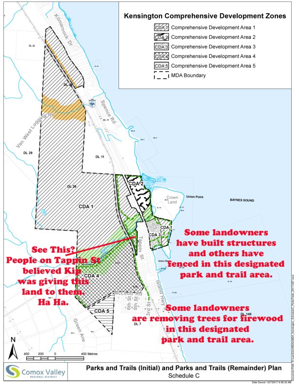 That little piece of land is now officially designated as parks and trails in the revised Master Development Agreement Dec. 8, 2017. See page 27 of the following document: http://agendaminutes.comoxvalleyrd.ca/Agenda_minutes/CVRDBoard/BRD/12-Dec-17/20171208_Dyson_KIP_SR_Proposed_MDA_Revisions.pdf