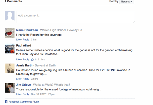 UBID People Upset About Missing 17 Minutes (important motion) Erased by Union Bay Improvement District November Meeting Date: December 19, 2017Author: allthingsunionbay 0 Comments Comments left on the article below: https://www.comoxvalleyrecord.com/news/erased-video-footage-of-board-meeting-puts-blight-on-union-bay-improvement-district/ Share this: Share on X (Opens in new window) X Email a link to a friend (Opens in new window) Email Share on Facebook (Opens in new window) Facebook Print (Opens in new window) Print Like Loading...