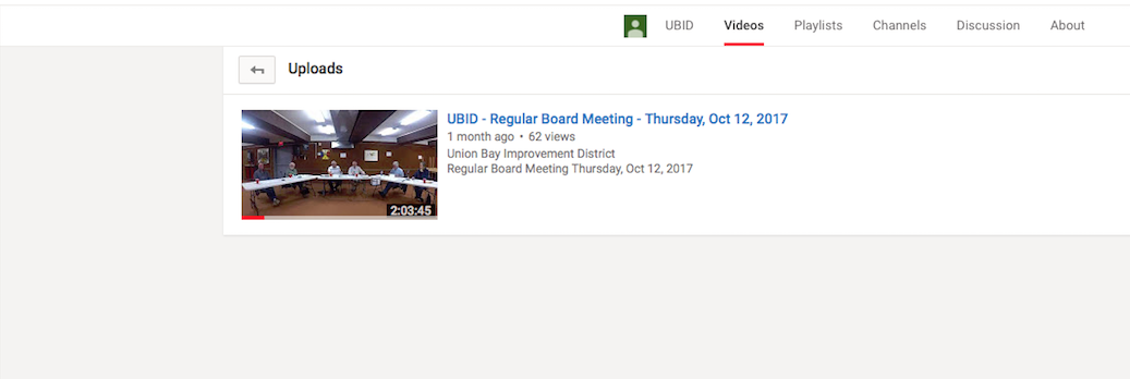 You will note that now the Oct. and Nov. 2017 meetings are no longer available on the UBID website so you can’t go back and view those meetings. The Union Bay Improvement District Youtube account only displays the Oct. 2017 meeting.