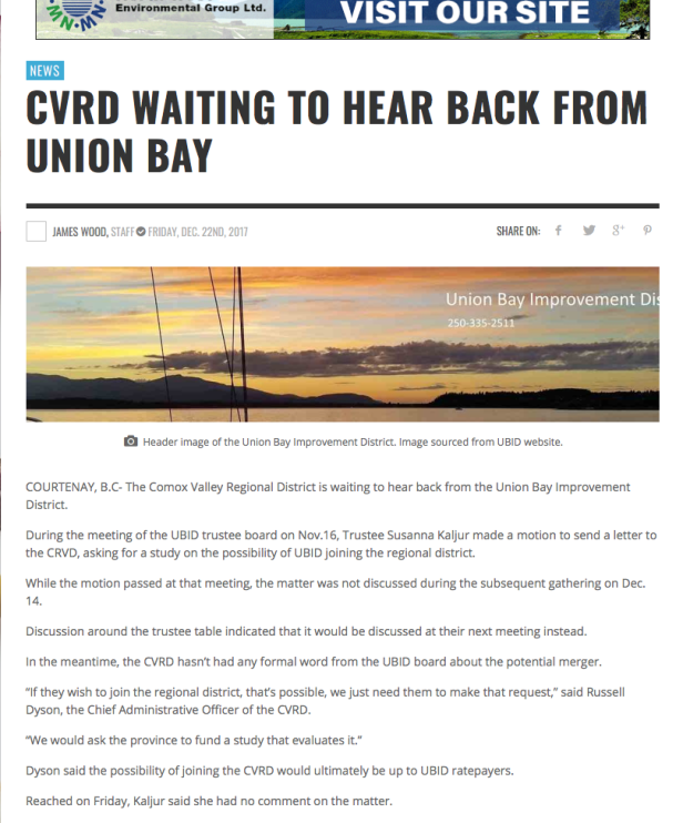 UBID More Coverage of Union Bay Improvement District Trying to Pull a Fast One on the Electorate Date: December 24, 2017Author: allthingsunionbay 0 Comments CVRD waiting to hear back from Union Bay Share this: Click to share on X (Opens in new window) X Click to email a link to a friend (Opens in new window) Email Click to share on Facebook (Opens in new window) Facebook Click to print (Opens in new window) Print Like Loading...