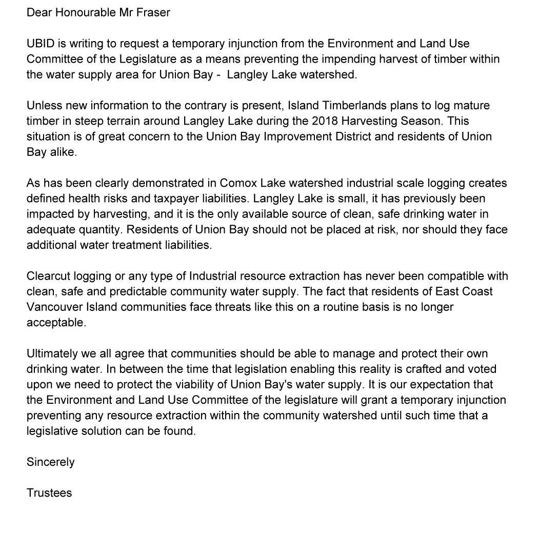 I have contacted Area A representative Jolliffe and asked him to provide a similar letter. I recommend you reinforce with him the sensibility of this request. In addition I have asked Vancouver Island Water Watch Coalition to do the same. Which they have agreed. I note that Vancouver Island Water Watch Coalition has been an active ally of UBID in the past when it comes to protecting our drinking water.