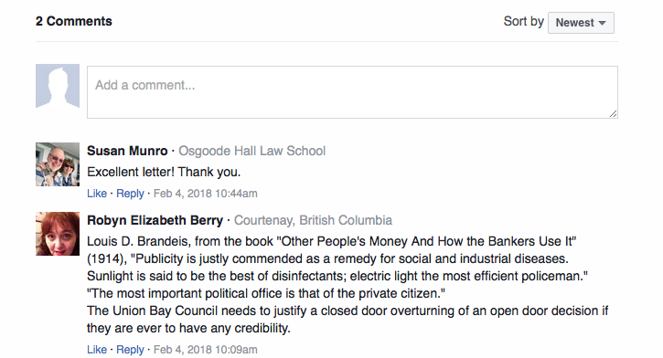 After many months of discussions a new agreement was reached with the developer and land was transferred last December to the Union Bay Improvement District for the community to build its own treatment plant. During these difficult negotiations a petition had been circulated and signed by over 400 residents requesting that UBID’s assets be transferred to the CVRD. Clearly, residents were worried that they were losing control of their water services. This petition was signed over a year ago. In a board meeting held in November 2017 the board approved a motion by one of the trustees to write a letter (two paragraphs would be sufficient) asking the CVRD to commence a study, at their expense, investigating the plusses and negatives of joining the CVRD.