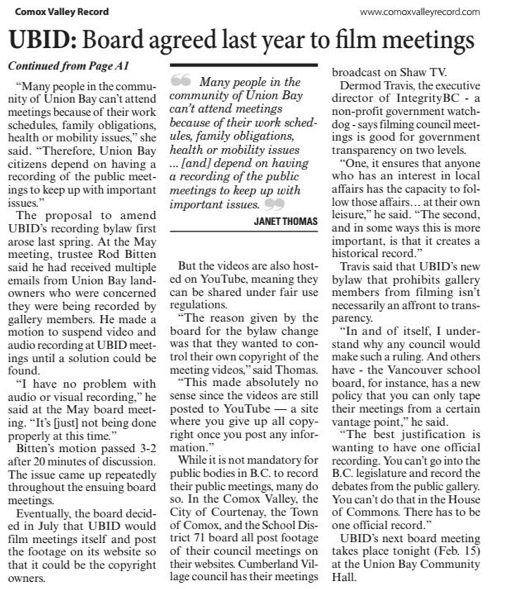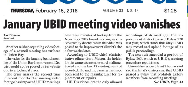 UBID January Union Bay Improvement District Meeting Video Vanishes Date: February 15, 2018Author: allthingsunionbay 0 Comments https://www.comoxvalleyrecord.com/e-editions/?iid=i20180215040809746&&headline=Q29tb3ggVmFsbGV5IFJlY29yZCwgRmVicnVhcnkgMTUsIDIwMTg=&&doc_id=180215120843-f10f6fb54333485b8965d13f41c89aad Share this: Share on X (Opens in new window) X Email a link to a friend (Opens in new window) Email Share on Facebook (Opens in new window) Facebook Print (Opens in new window) Print Like Loading...