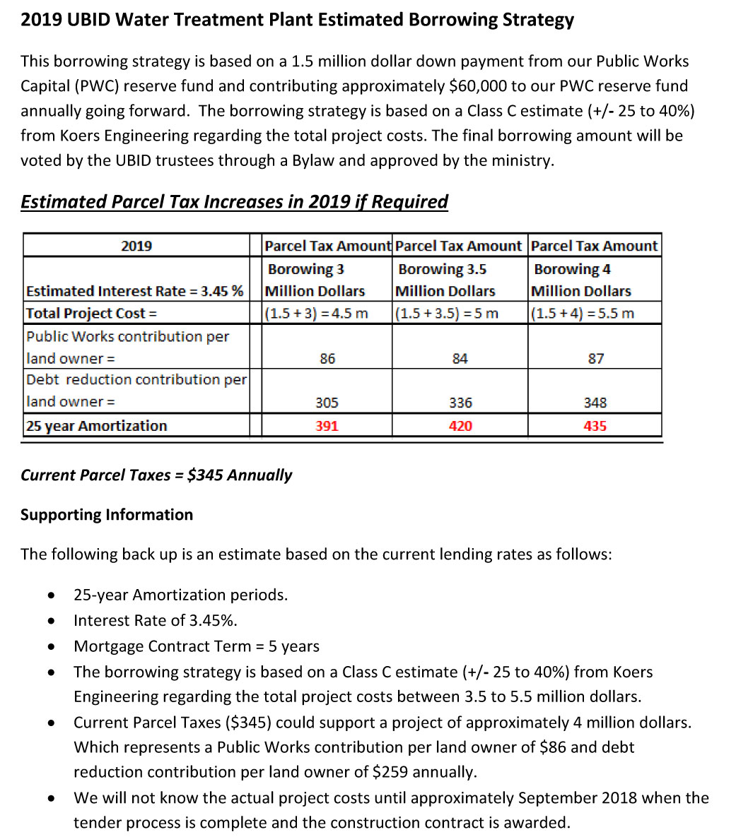For those wondering what the interest costs are going to be for the water filtration system. UBID’s original figures started at $2 Million and now they are considering borrowing up to $4 Million.