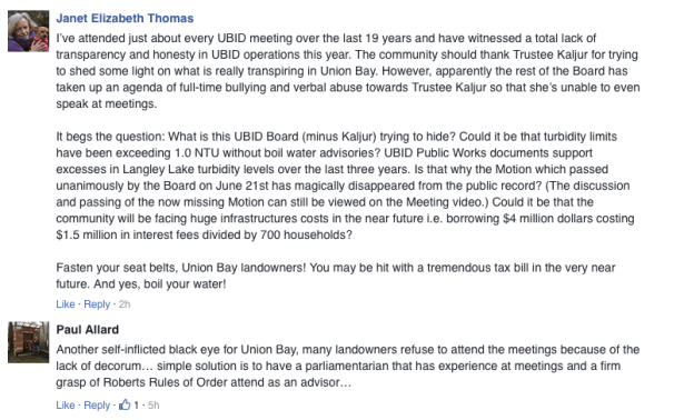 “Specific questions about efforts by the trustees to improve their working relationships should be directed to the Union Bay Improvement District, as they are in the best position to comment on the details of such matters.”