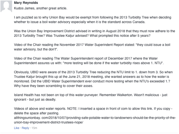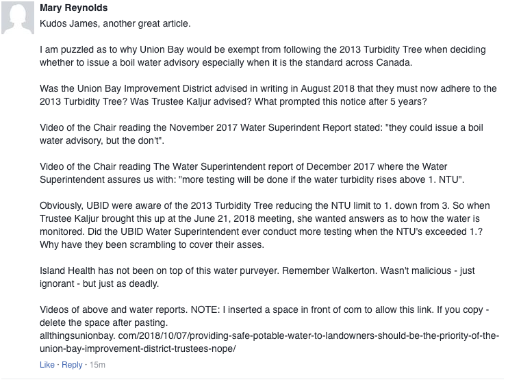 That’s according to Charmaine Enns, a medical health officer with Island Health. The MyComoxValleyNow.comnewsroom had reached out to Island Health to get the official word on turbidity and Union Bay’s water system, and Enns supplied information.