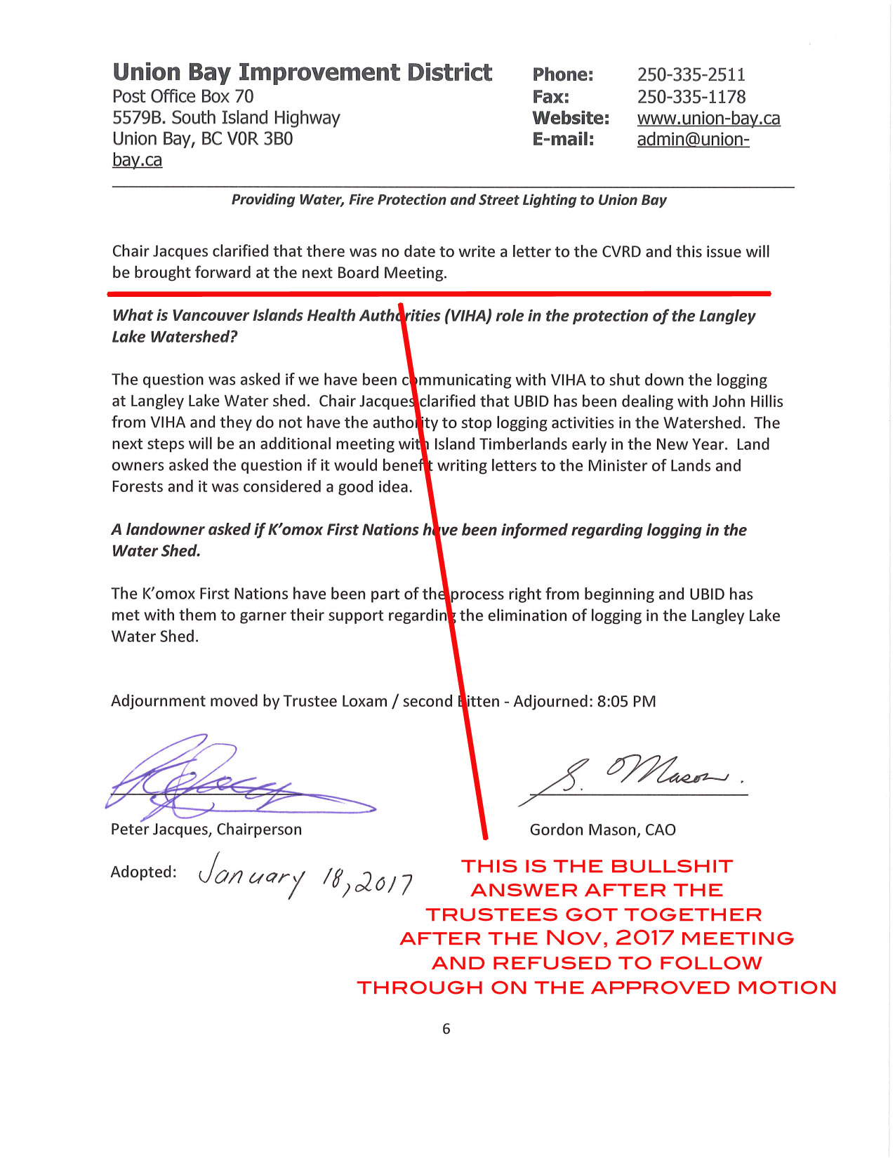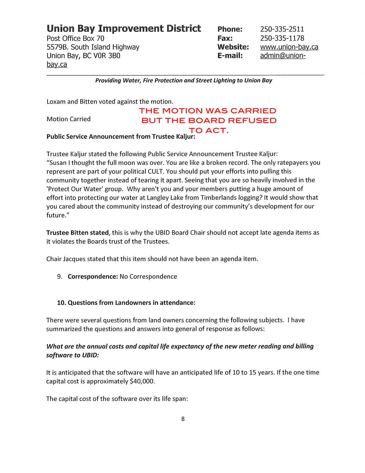 Here is the motion and the missing discussion which the board passed and then refused to follow through with the admin contacting the province and obtaining a letter telling them to get the Water Filtration System going. What a wimp.