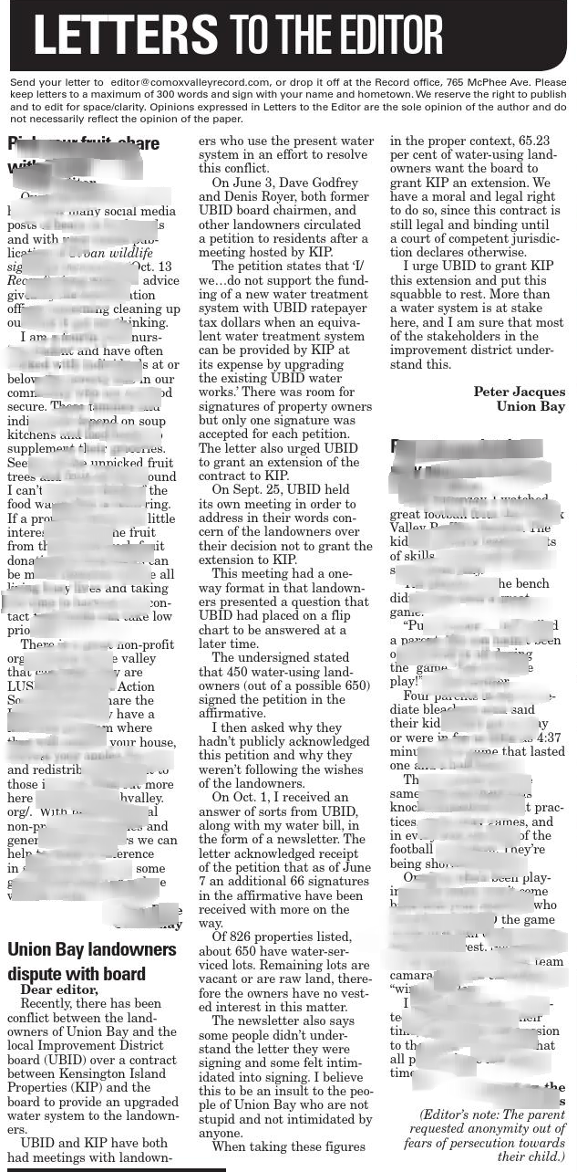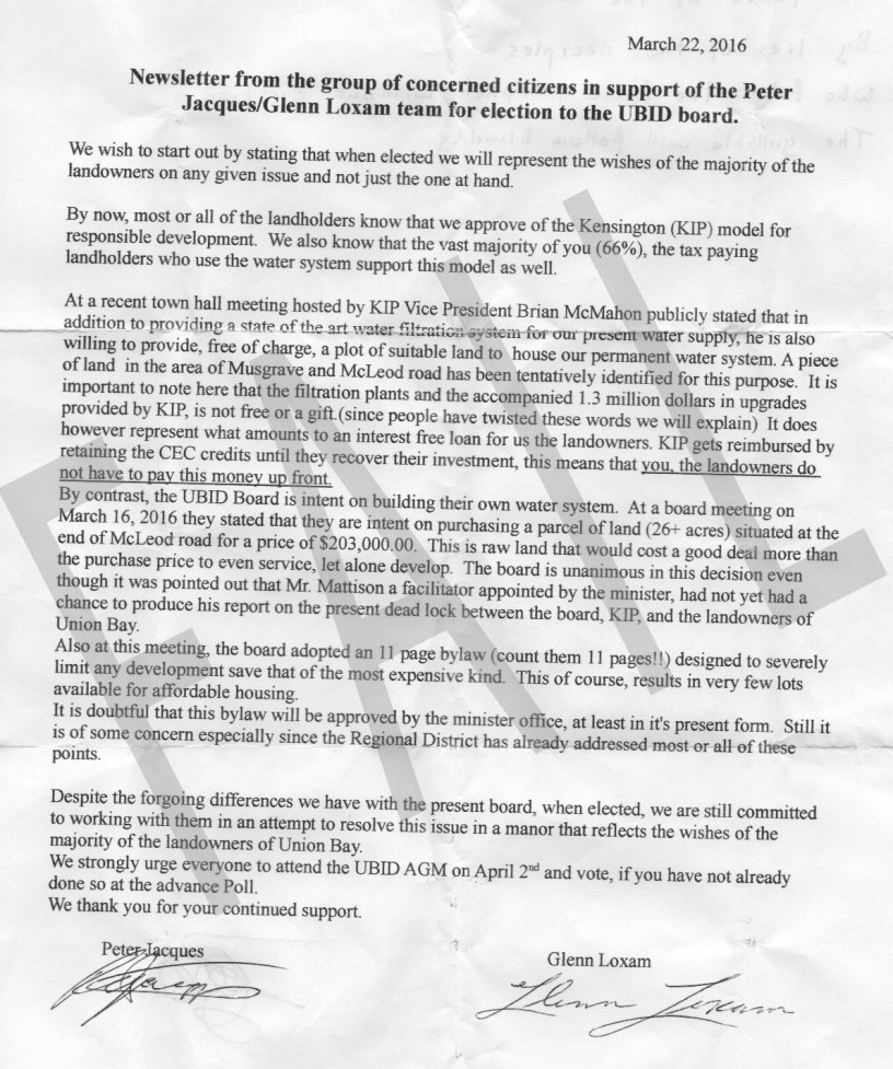 Absolute bullshit in this letter to the editor from Nov. 3, 2015, regarding extending the expired 2011 Water Infrastructure Agreement that lapsed Dec. 31, 2014 with this completely false statement: “We have a moral and legal right to do so, since this contract is still legal and binding until a court of competent jurisdiction declares otherwise.” It sounds exactly like what the VP of KIP was claiming doesn’t it? The previous board advised the agreement was expired/dead. The CVRD also advised the agreement was expired/dead. It was just the saviour of Union Bay who was singing that tune.