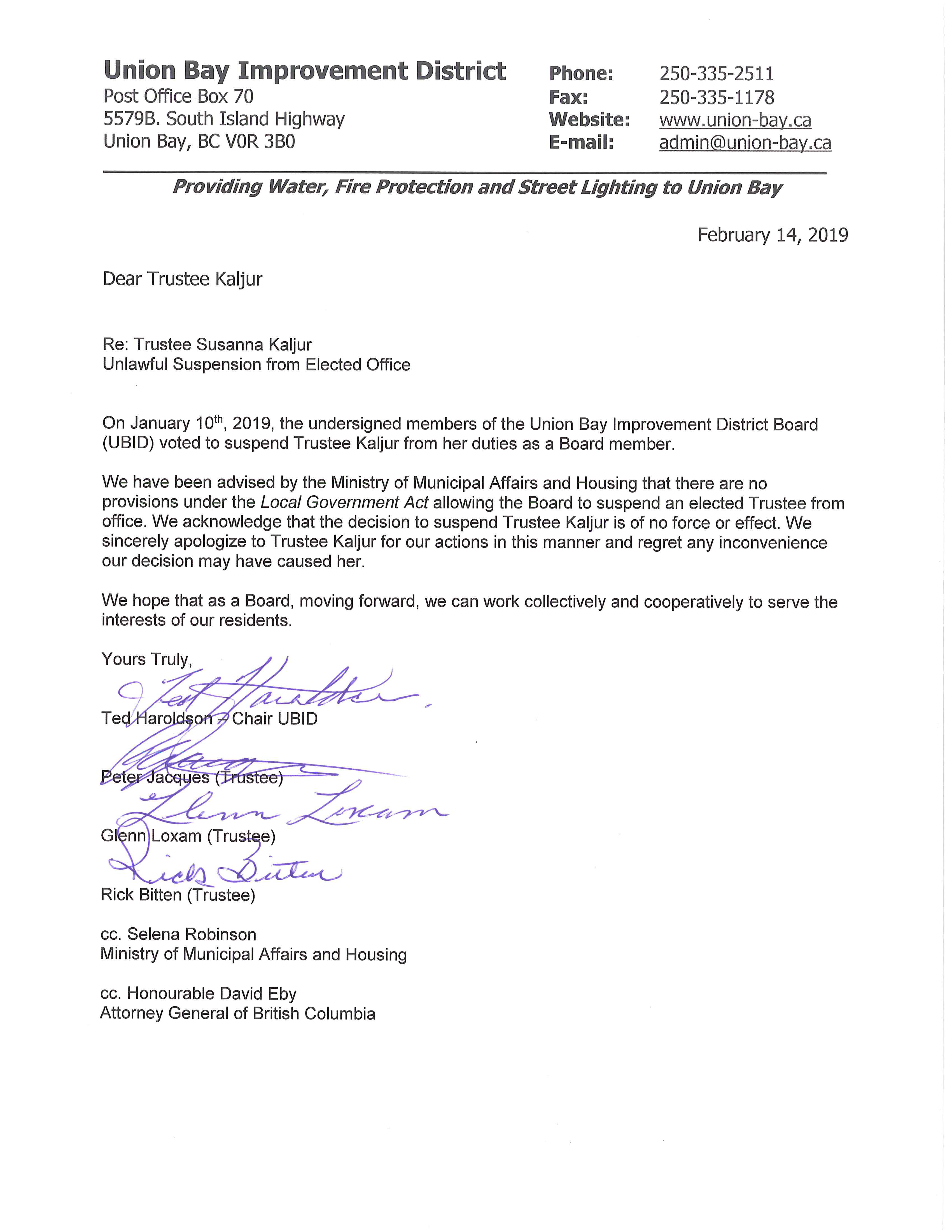 “Specific questions about efforts by the trustees to improve their working relationships should be directed to the Union Bay Improvement District, as they are in the best position to comment on the details of such matters.”