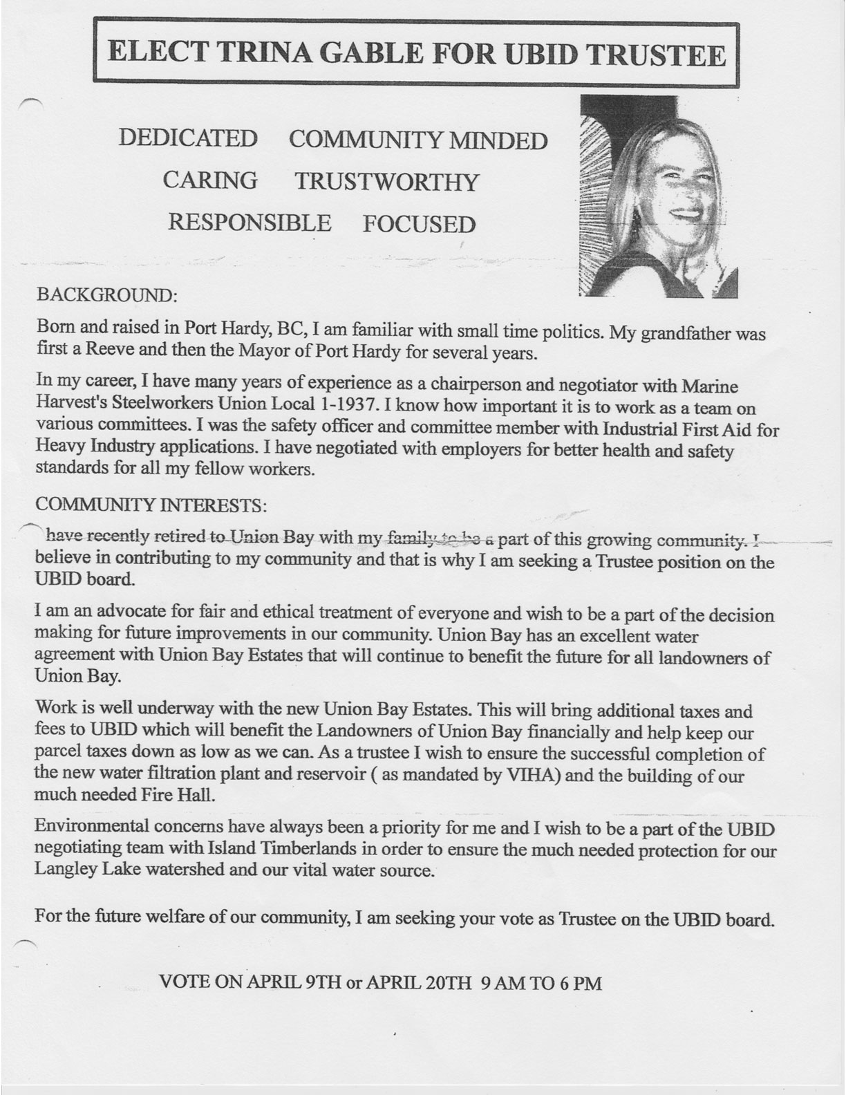 UBID 4 Candidates for 2 Union Bay Improvement District trustee positions. Who best represents the future of Union Bay? This is about millions of dollars – who wants you to keep more money in your pocket? Who wants you to keep paying with no help? Date: March 30, 2019Author: allthingsunionbay 0 Comments For more info on what Loxam and Gable are offering: http://www.unionbaytoday.com/ Share this: Click to share on X (Opens in new window) X Click to email a link to a friend (Opens in new window) Email Click to share on Facebook (Opens in new window) Facebook Click to print (Opens in new window) Print Like Loading...