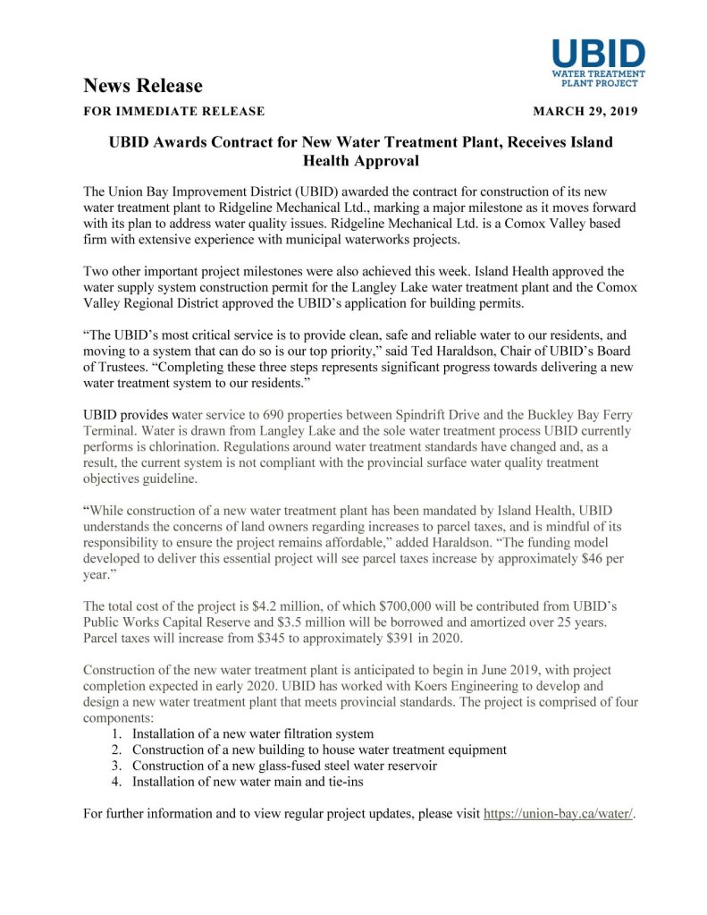 The Union Bay Improvement District (UBID) awarded the contract for construction of its new water treatment plant to Ridgeline Mechanical Ltd., finally addressing water quality issues in the area.