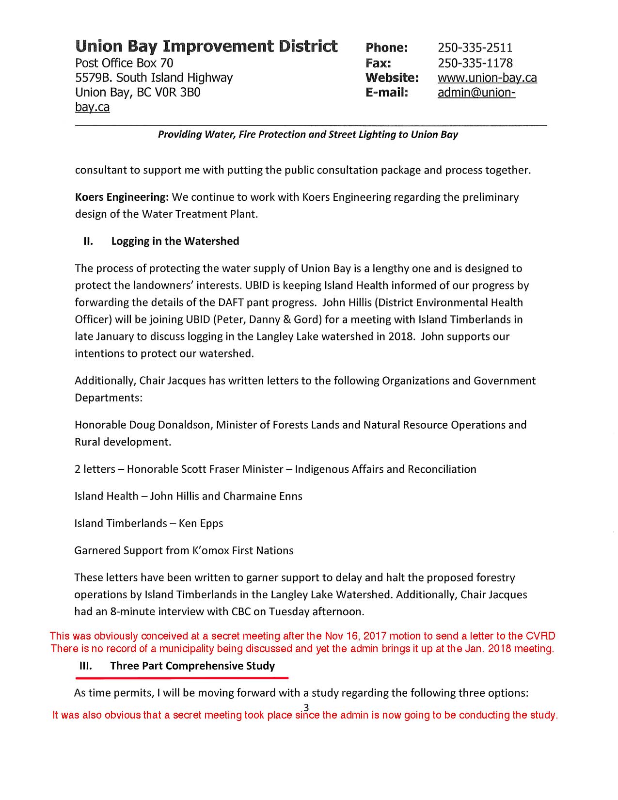 We knew something was up when at the Dec. 2017 meeting we learned the board had made a decision at the COW meeting the prior day about the motion to send the letter to the CVRD. The Chair insisted they couldn’t discuss it because it wasn’t on the agenda. Trustee Elliott reminded the Chair that the board could only bring recomendations from COW meetings.