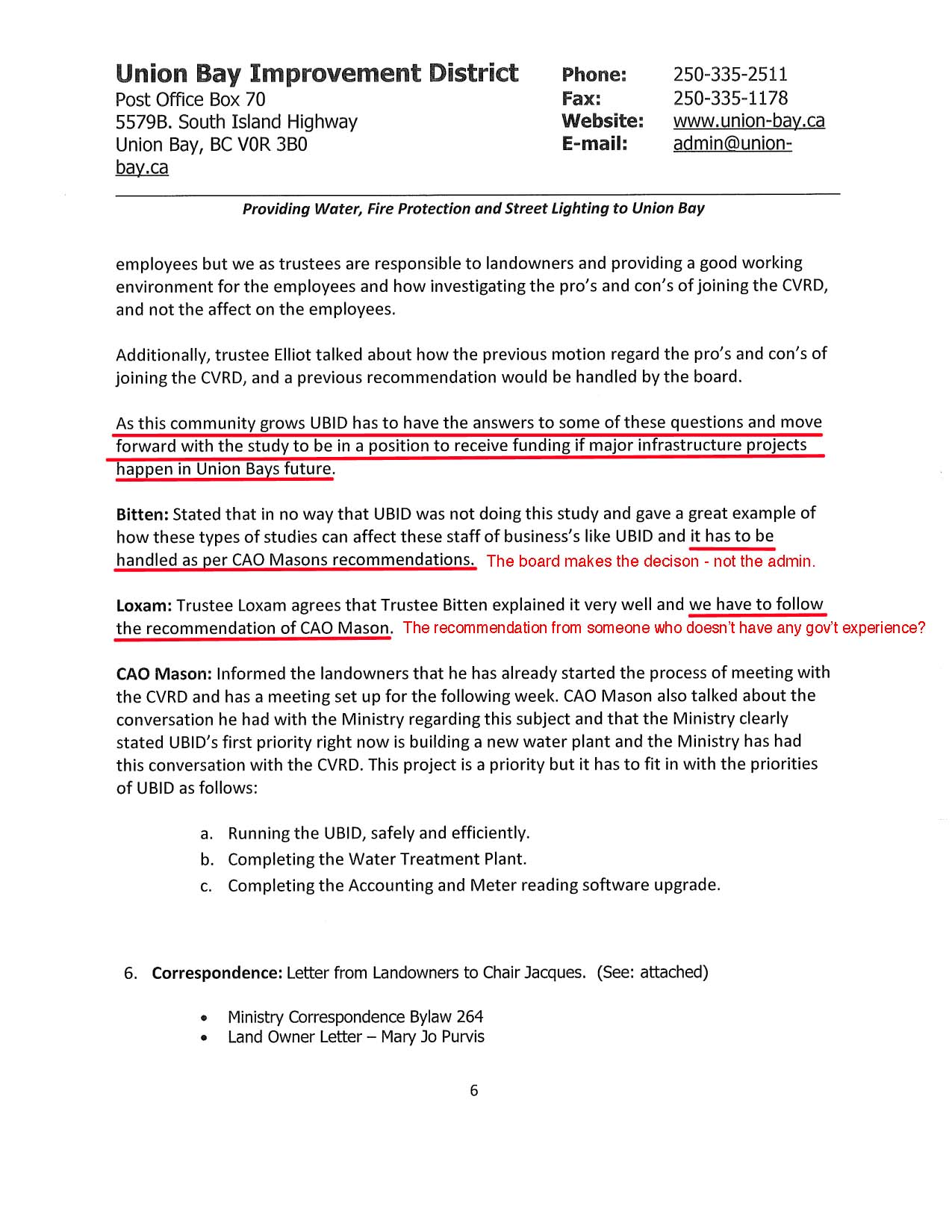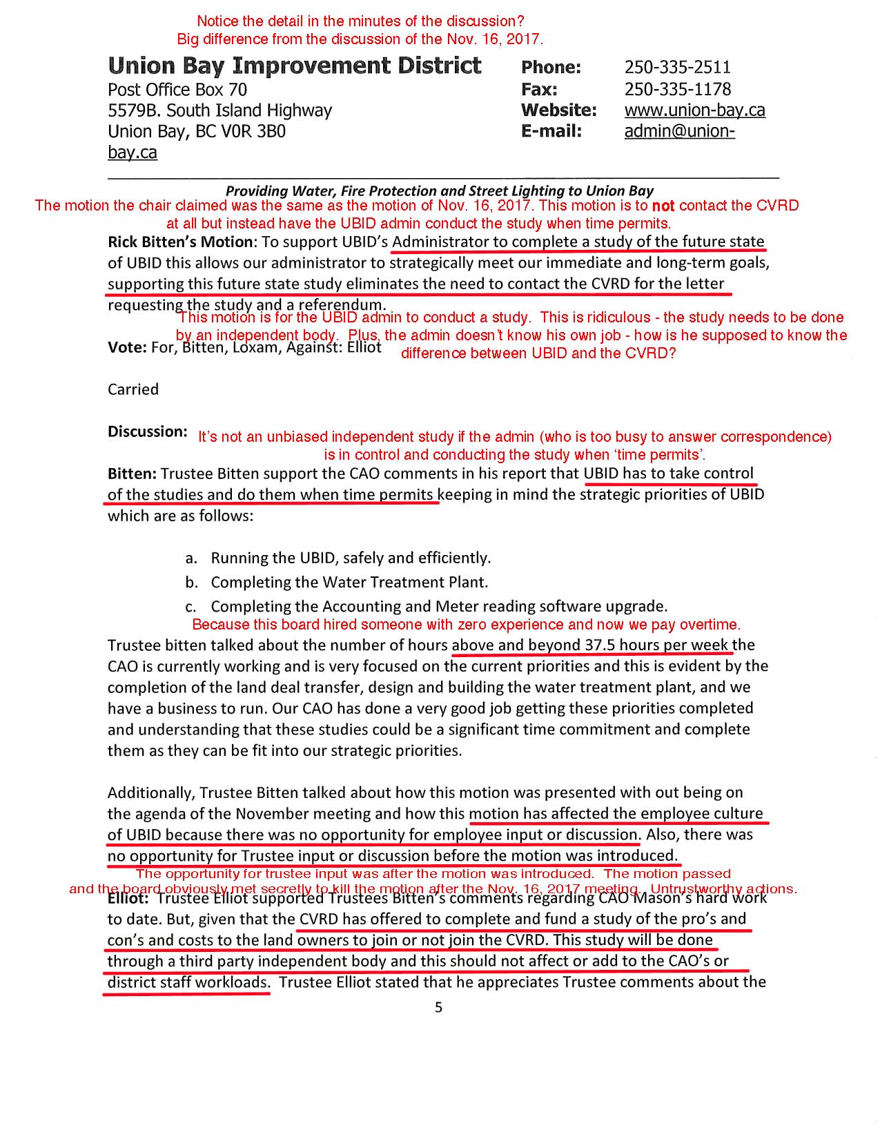 Now instead of an independent study at no cost we are being told the UBID admin will conduct the study in order to have control over it and it will also be done when time permits. In other words – never. The motion clearly states there will be no letter to the CVRD.