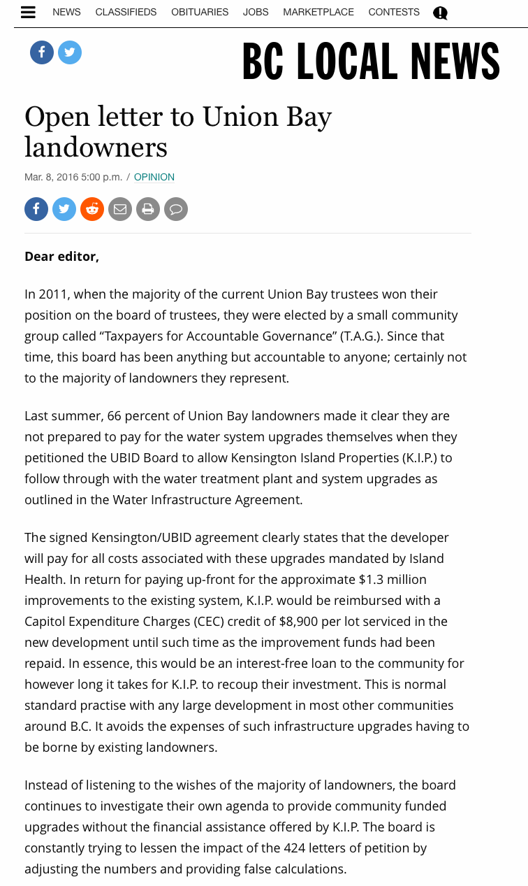 David Godfrey known as the KIP spokesperson spinning more bullshit. Things were progressing well in Union Bay in 2015, with a board who planned a new treatment plant and eventually purchased the very piece of land by Langley Lake that KIP’s own consultants targeted as a prime spot for the plant.