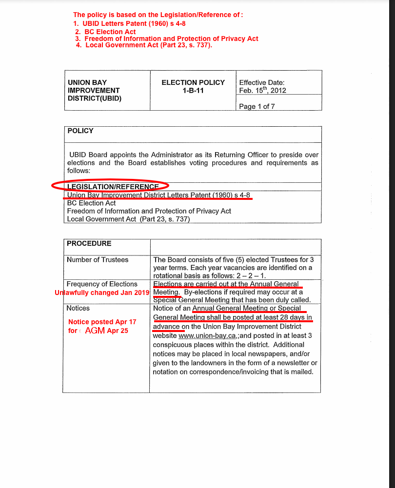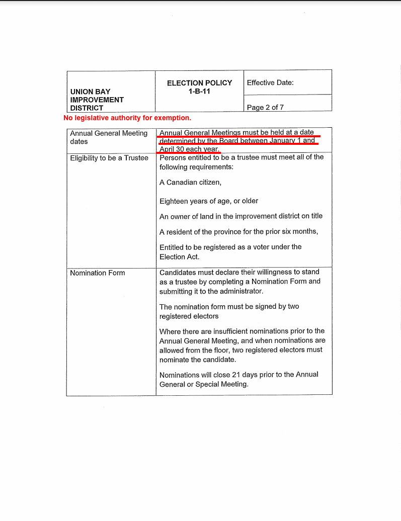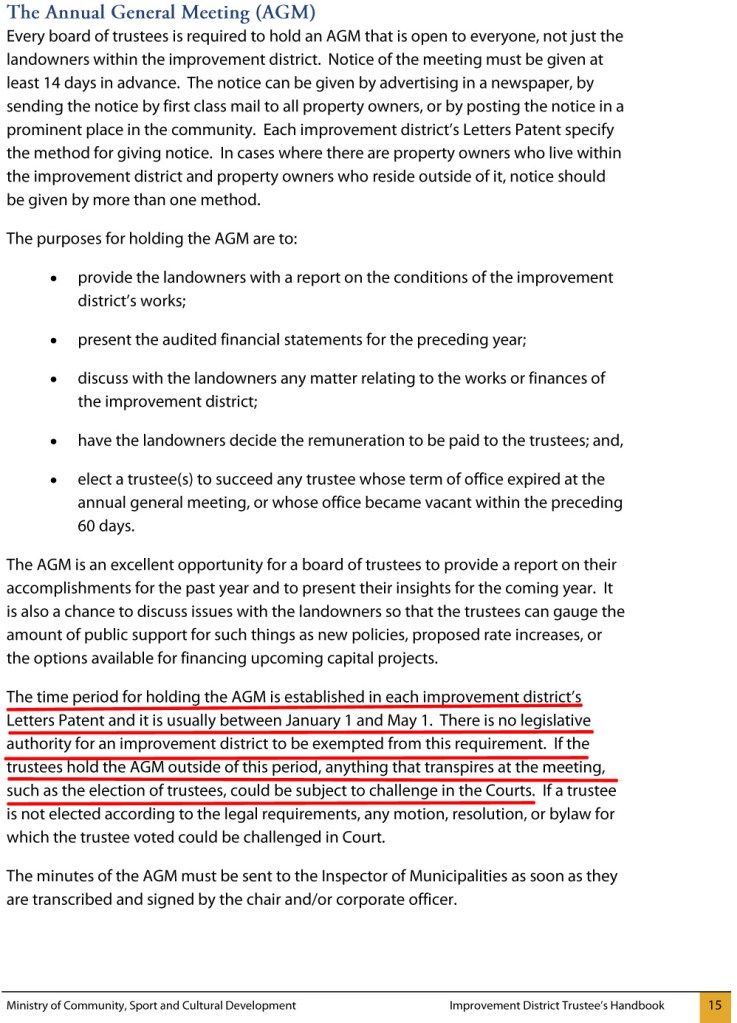 The document underlined in red below is from the Trustees Handbook. https://www2.gov.bc.ca/assets/gov/british-columbians-our-governments/local-governments/governance-powers/improvement_district_trustees_handbook.pdf You will notice it references the time period to hold the AGM is established in each Improvement District’s Letters Patent. We heard a lot about the Letters Patent over the years and it appears to be the bible when it comes to UBID.