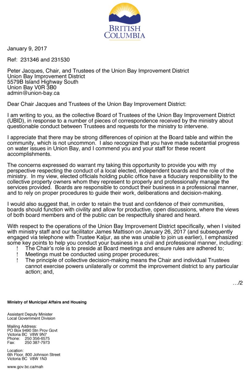 The three of you have abandoned Union Bay and allowed it to become a dictatorship. Fassbender interfered appointing a Facilitator on behalf of a bloody developer and yet you claim you never get involved in a governing body. You had to know in Oct. 2016 that you couldn’t suddenly create a whole new board with zero experience and expect it to function – it was doomed from the start. The inexperienced board went on to hire an Administrator who had zero government experience. You interfered again by telling the board we shouldn’t attempt to obtain a study as to the pros and cons of becoming a service area of the CVRD while we are building a treatment plant. They keep hauling out your letter stating they have to abide by the Ministry – the very people claiming they don’t get involved. They completely ignored your Jan. 2018 letter advising them how to conduct meetings and only made it public when Trustee Kaljur insisted.